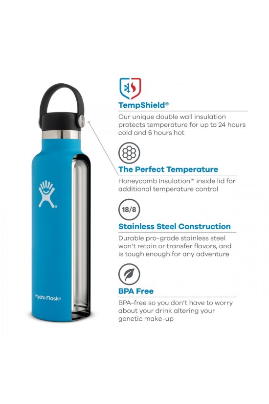 HYDRO FLASK keeps drinks cold for up to 24 hours or hot for up to 12 hours. TempShield insulation ™ Exclusive double-wall vacuum insulation protects the temperature for hours. Cold drinks stay frozen and hot drinks stay hot, so you can cool off for any adventure. Eliminates condensation and reduces weight. Durable 18/8 Pro-Grade stainless steel construction. The ideal companion for your trips to the mountains or to the sea, in summer and winter. Cold or warm from dawn to dusk.