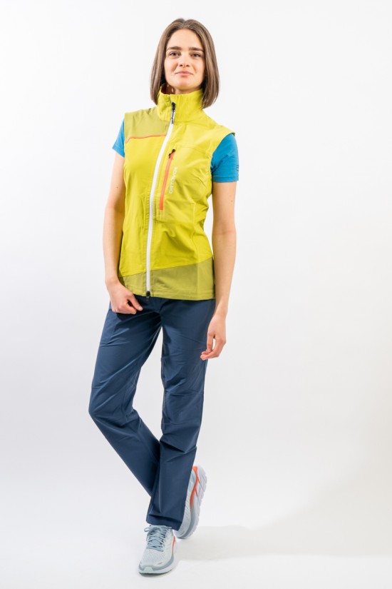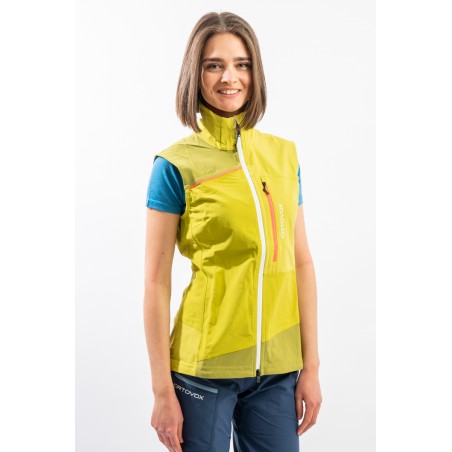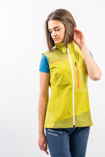 PALA VEST woman is made of windproof and water-repellent material (DWR treatment) in order to offer sufficient protection from wind and light precipitation. Breathability is ensured by the membraneless structure and the fine Merino wool inside. Reinforced areas on the shoulders, forearm and sides protect the lightweight shell upon contact with rock. ORTOVOX WOOL PROMISED.