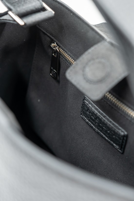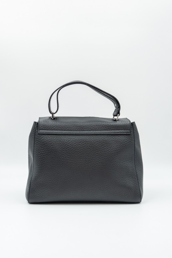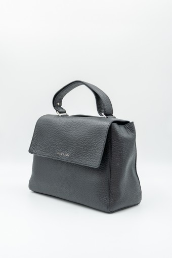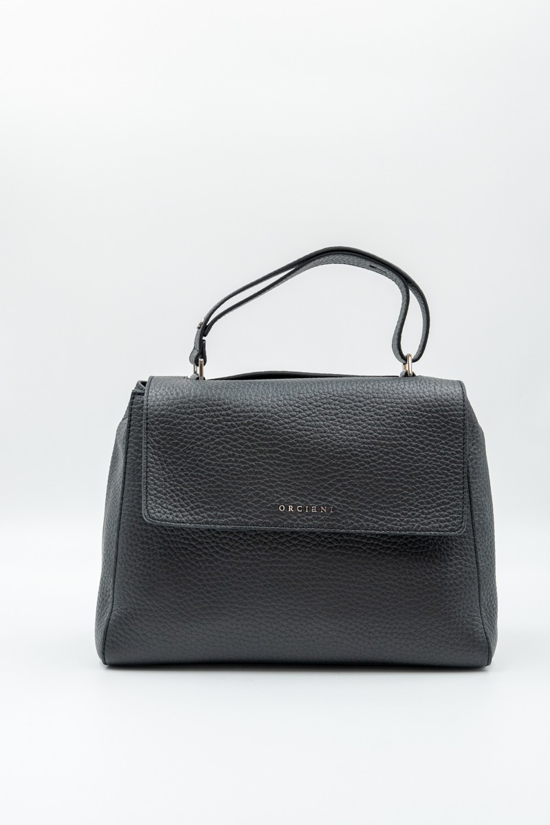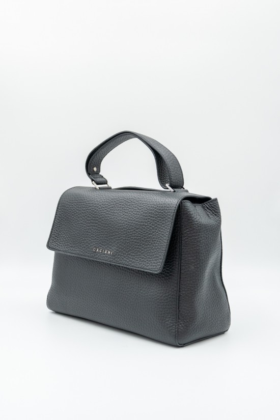 The iconic bag by ORCIANI Sveva in the medium version made of hammered leather. Practical and versatile, to be carried by hand, on the shoulder or over the shoulder. Magnetic button closure. Inside zip pocket. Precious polished metal details. Made in Italy.