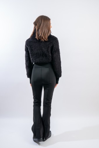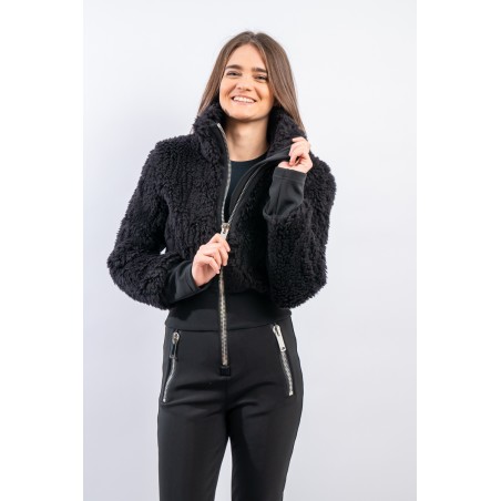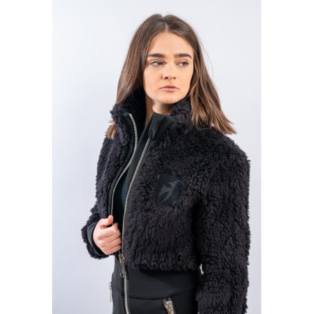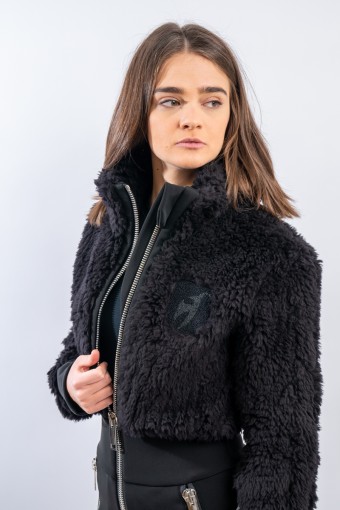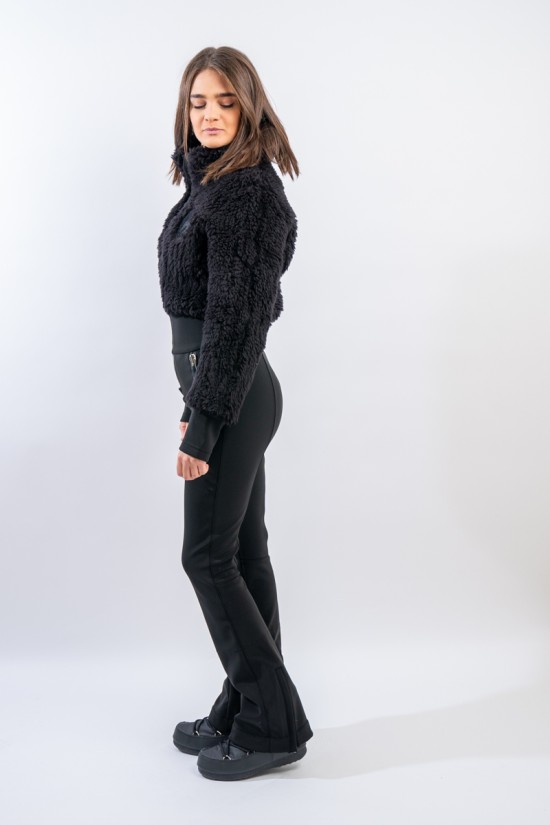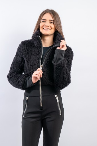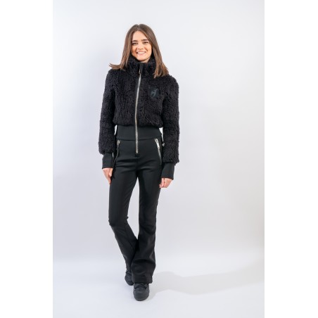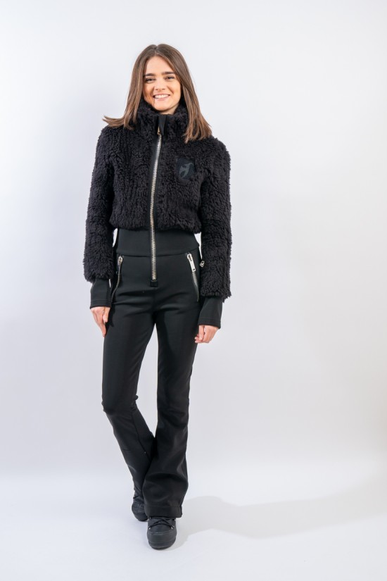 Eva one-piece suit signed TONI SAILER. Made with a mix of sophisticated and functional materials. The upper part in virgin wool, worked with a teddy bear effect, blends with the lower part made of Swiss Schoeller, stretchy, water-repellent and windproof. The standing neck and fully lined interior provide a feeling of pleasant warmth and softness. To complete the garment the zip metallic look and the brightness of the fabric. Modern and practical, it is a must have for winter 2022-23, to face every track with style.