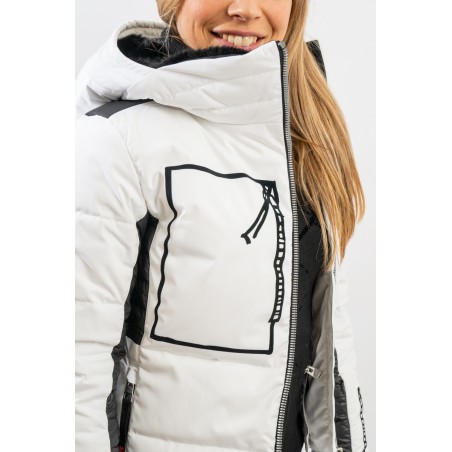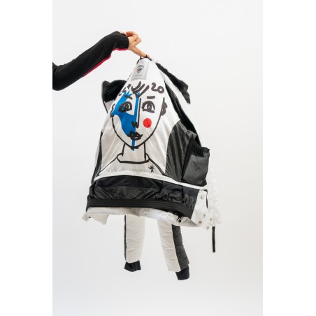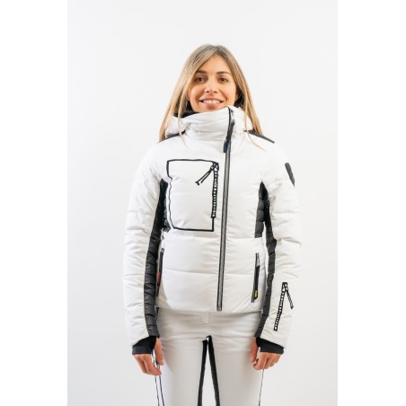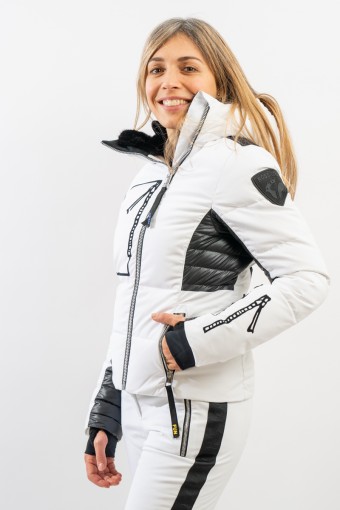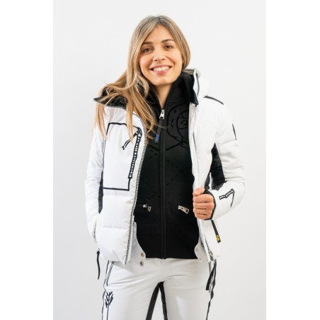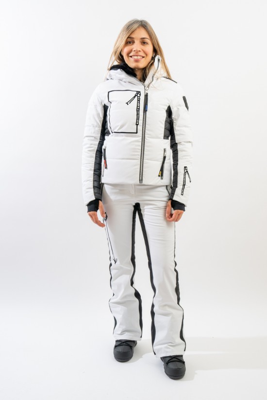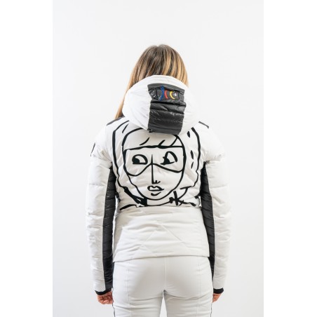 Stellar is the down jacket belonging to the celebratory line of 20 years of collaboration with the designer Jean-Charles de Castelbajac. High performance functionality and attractive design come together in this technical and original garment. Highly waterproof and breathable. The graphic print on refined and soft nylon is combined with contrasting inserts with boudin quilting. Warm thanks to the padded 90/10 duvet and the large hood lined with ecofur. The various snow protection options ensure optimal protection and insulation. The ideal garment to tackle every track with style in total safety.