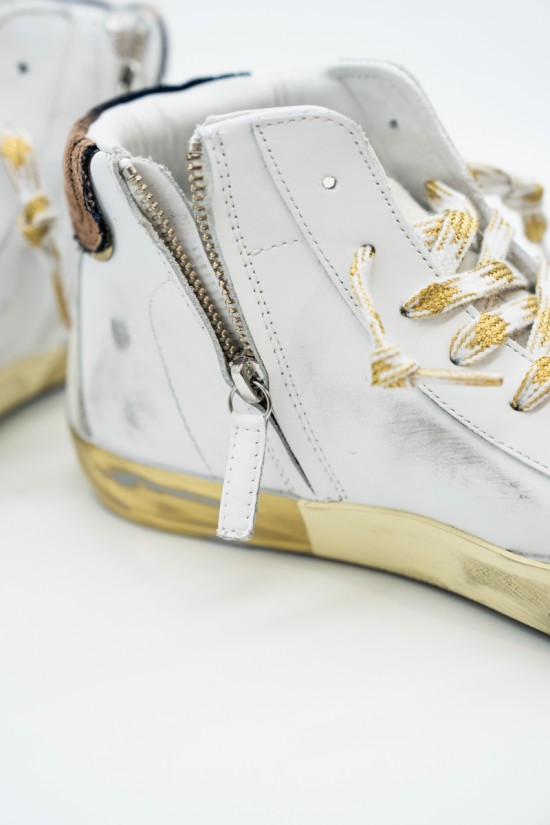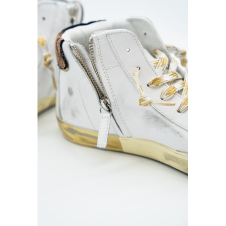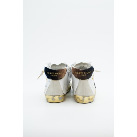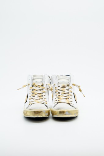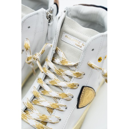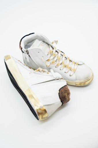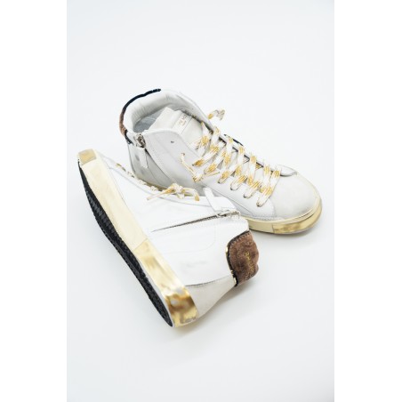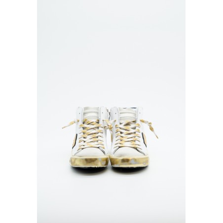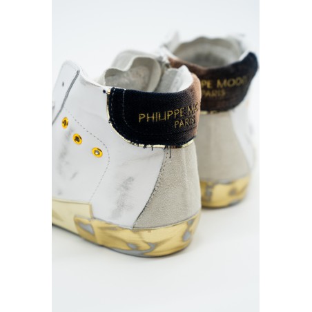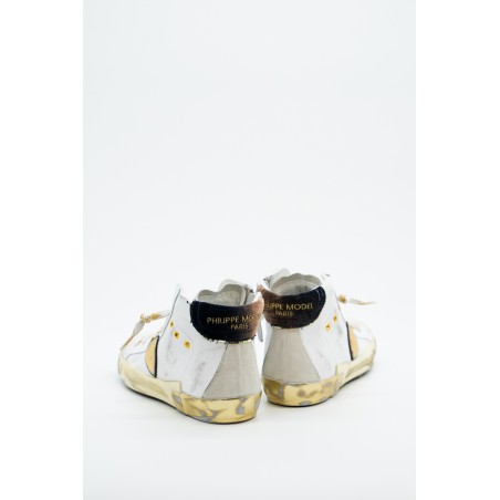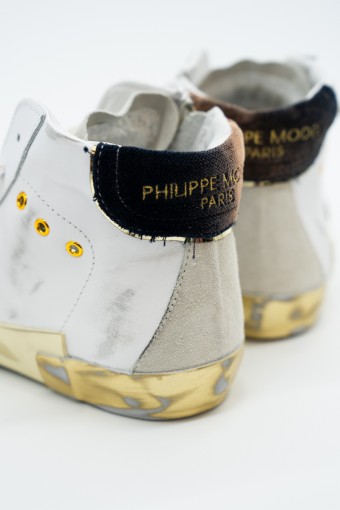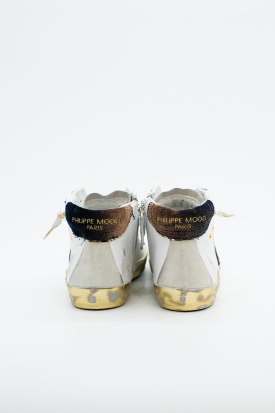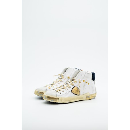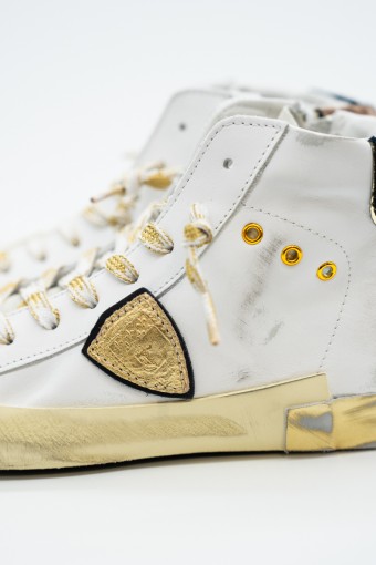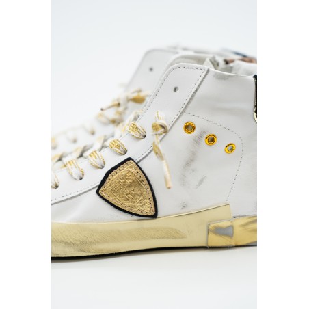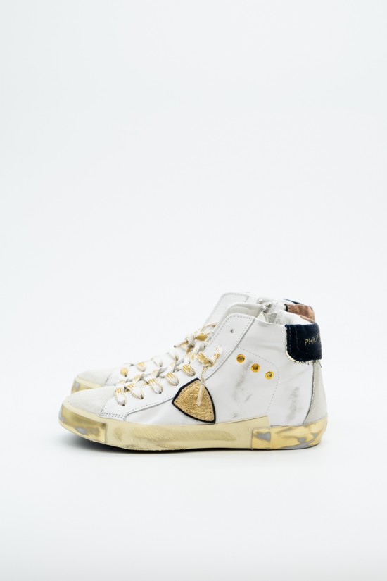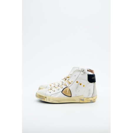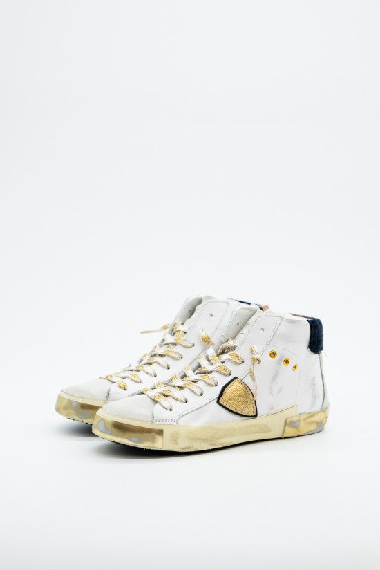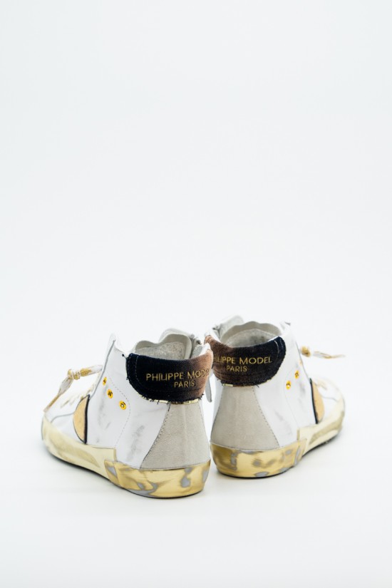 The PRSX women's high-top model by PHILIPPE MODEL is made of soft washed and soiled vintage-effect calfskin with suede details in soft shades. "Philppe Model" shield in gold laminated leather with contrasting black leather trim applied to the side. Embellished with a velvet spoiler with a gradient effect and silver laminated piping with embroidered lettering logo. The rubber sole is enriched with mirror-effect fabric details. Made in Italy