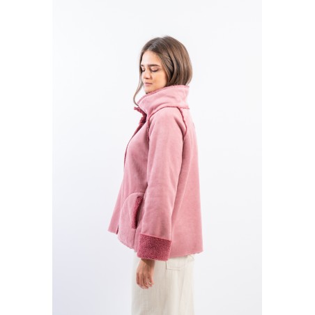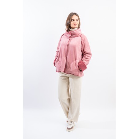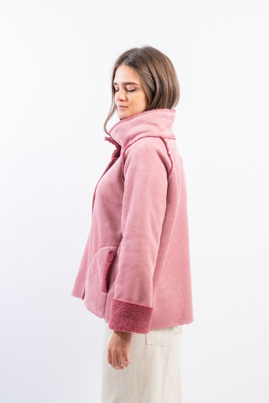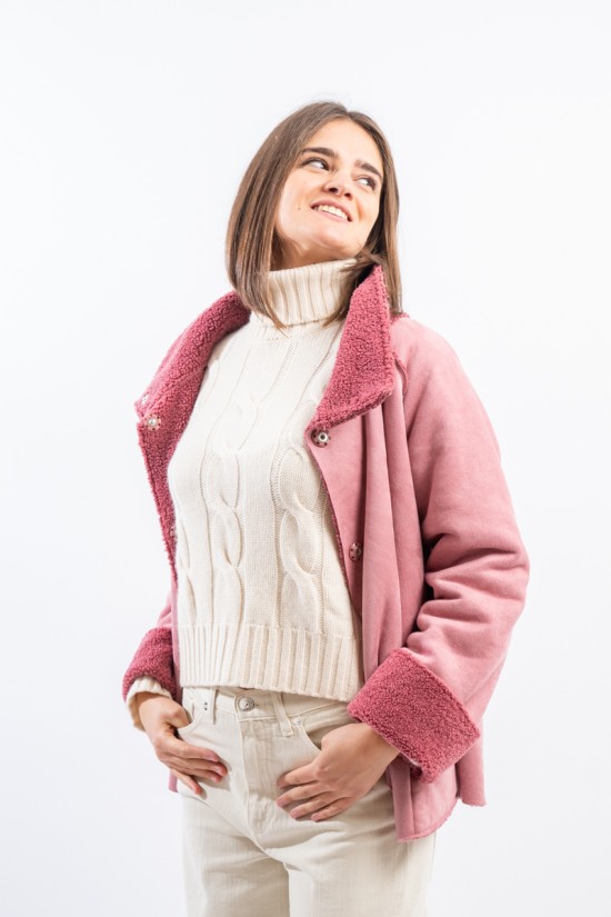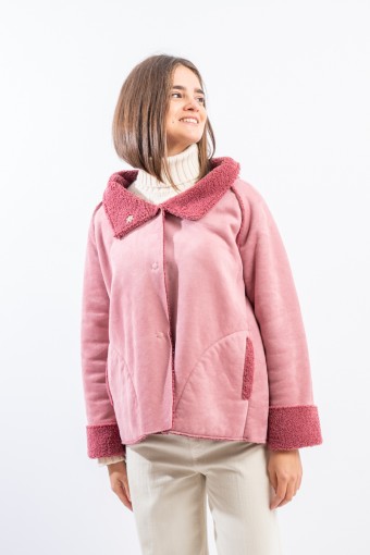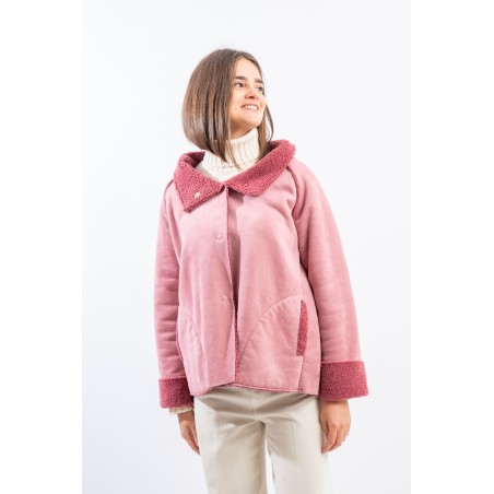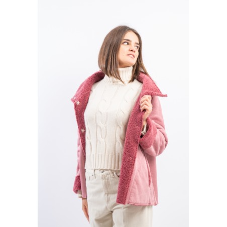 Hood made of eco-sheepskin. Stand-up collar and snap button closure, embellished with visible stitching and faux fur trim. Mid-over fit. Made in Italy.