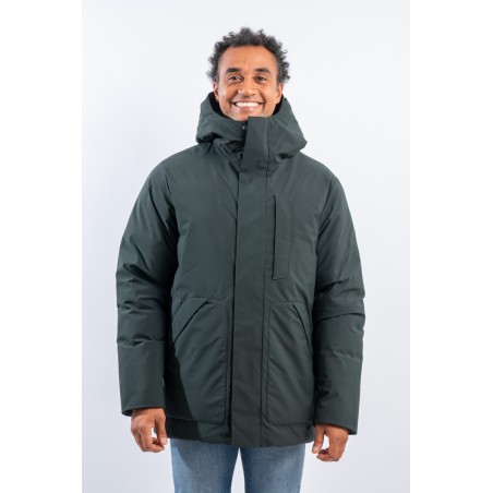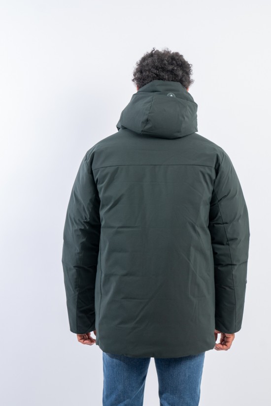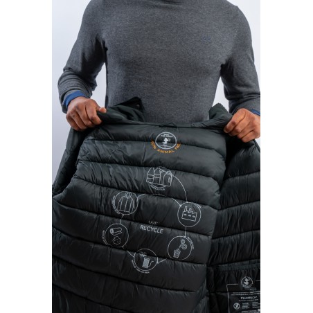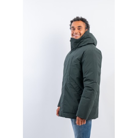 Medium-length jacket, with fixed hood. Made of smooth matt effect material, rainproof and windproof. The central black zip is concealed and closed by a flap with snap buttons, double slider. The padding in plumtech, recycled synthetic down, is an excellent alternative to real down and guarantees perfect thermal insulation even in cold temperatures. The side pockets with diagonal cut are closed by hidden zips on both sides, third service pocket, also closed with hidden zip. Cuffs closed by black stretch black lycra piping.