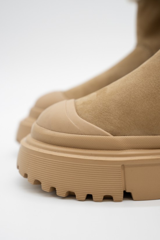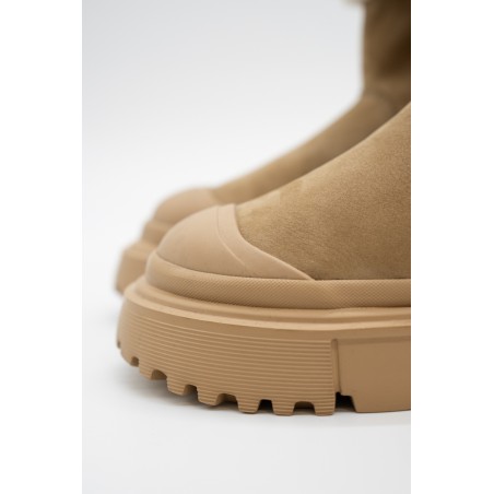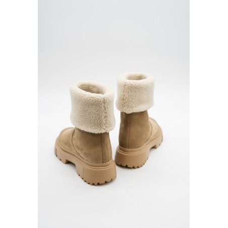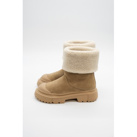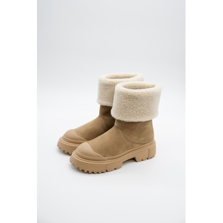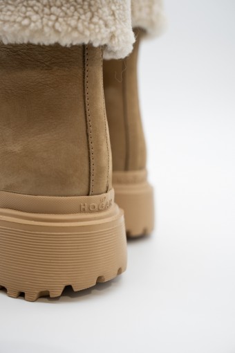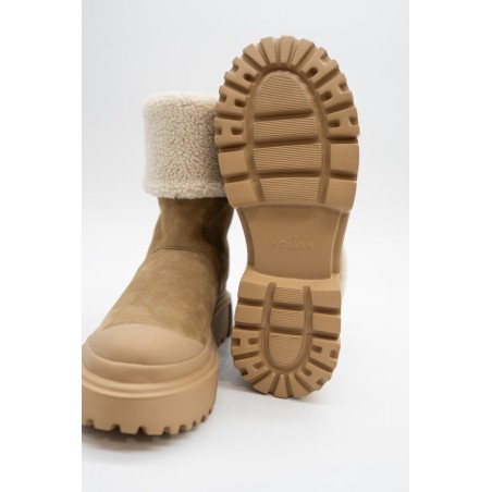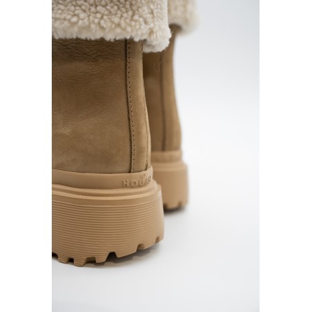 Warm and essential is the wintery ankle boot by HOGAN made of soft nubuck with a shaft and inner lining finished in warm bouclé fleece. The lug sole features ribbed details, while the tread features H-shaped outer lugs. To protect and at the same time give a touch of style, the toe is embellished with a tonal rubber detail. Ideal for tackling even the coldest climates.
