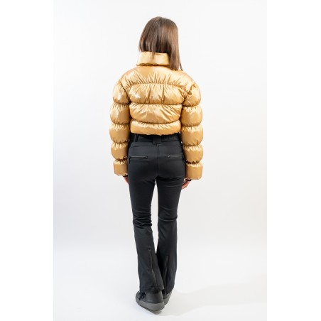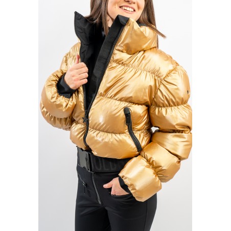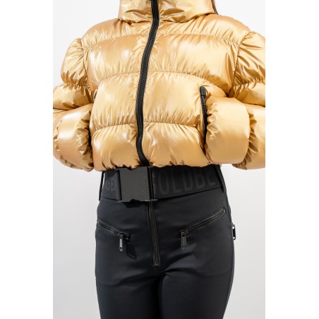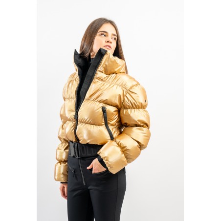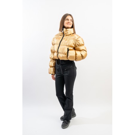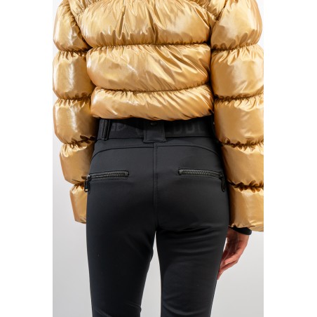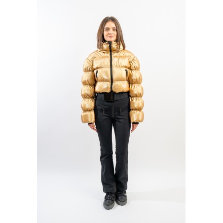 A play of volumes and precious details characterize this GOLDBERGH jumpsuit, effective and comfortable. Made of 4-way stretch fabric in the lower part and padded with soft Primaloft wadding and feathers. The belt at the waist emphasizes the shiluette and the contoured seams redesign the figure. The short turtleneck down jacket is soft and warm. The soft polyurethane-based fabric enhances its color. Enriched with wide elasticated boudines that give the garment an even more gritty and modern look.