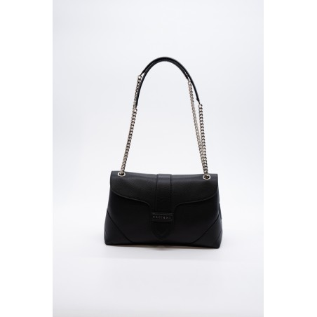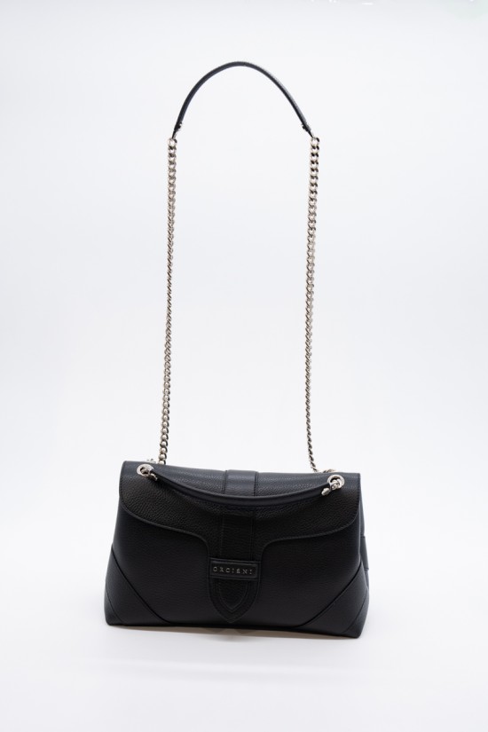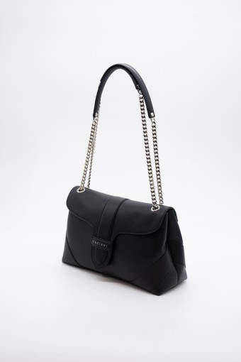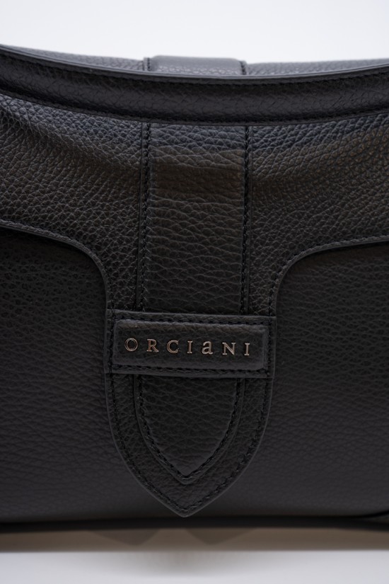 Modern and luxurious, the Alma shoulder bag by ORCIANI is presented. Made of soft grained leather. Practical and versatile, it can be worn over the shoulder or on the shoulder in two lengths. Embellished with tone-on-tone leather details stitched in relief and the particular curvy flap that bears the ORCIANI lettering logo. Magnetic button closure, interior lined completely in suede that has a large pocket closed by zip and two open pockets. Perfect to complete a special outfit for a special occasion. Strictly Made in Italy.