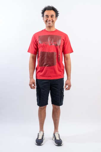 Garment-dyed cotton jersey crewneck T-shirt. Crew neck with ribbed neckline. Enlivened by the deliberately scratched maxi print, depicting the STONE ISLAND logo and the iconic Compass Rose on the chest. Regular fit.