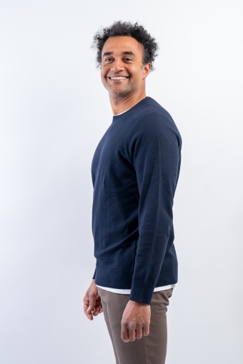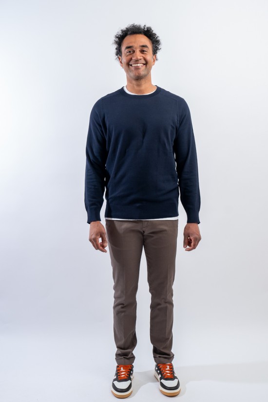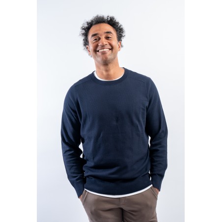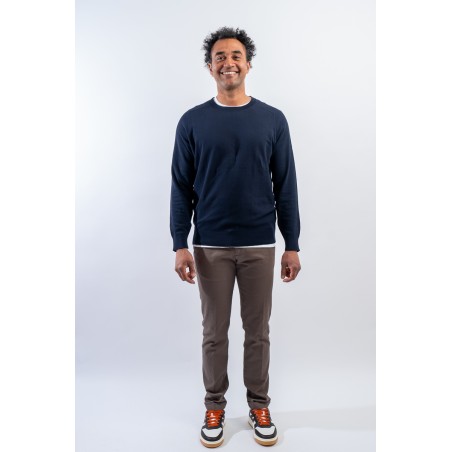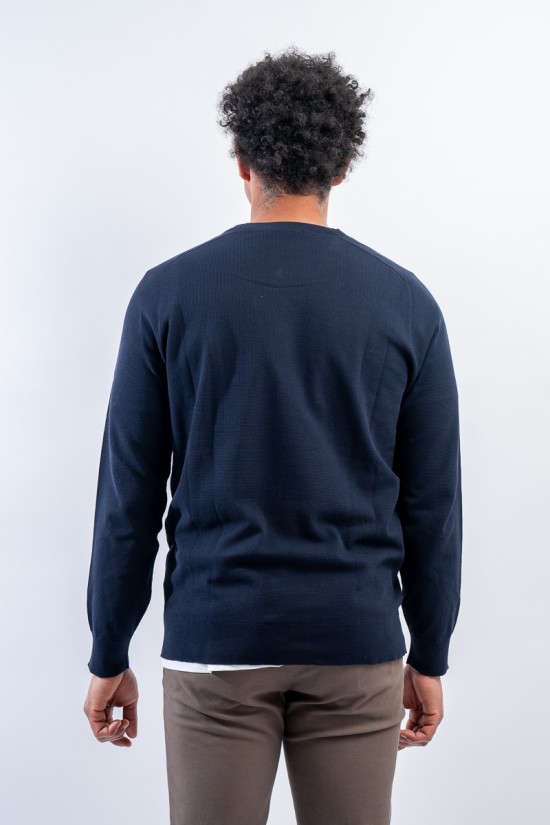 Crewneck sweater made of fine cotton signed KANGRA. Embellished with the all-over hammer stitch work. Elasticated ribbed collar, cuffs and hem. Strictly made in Italy.