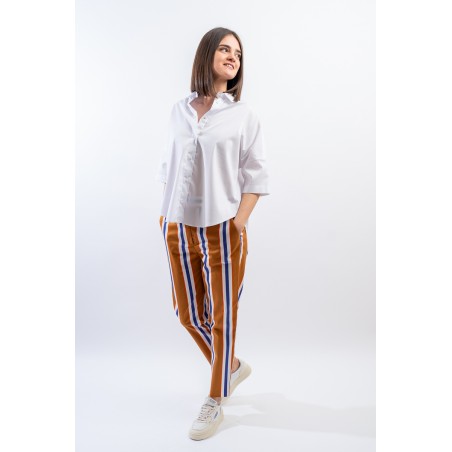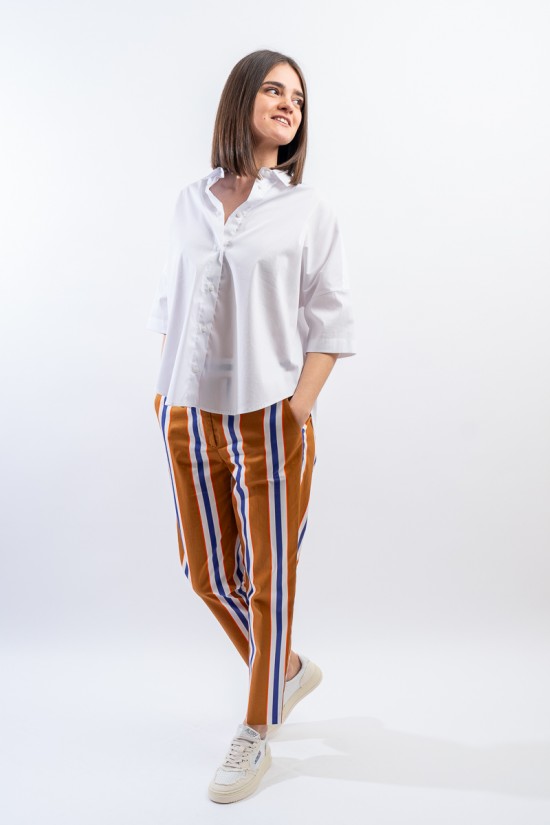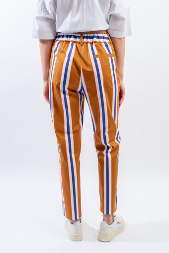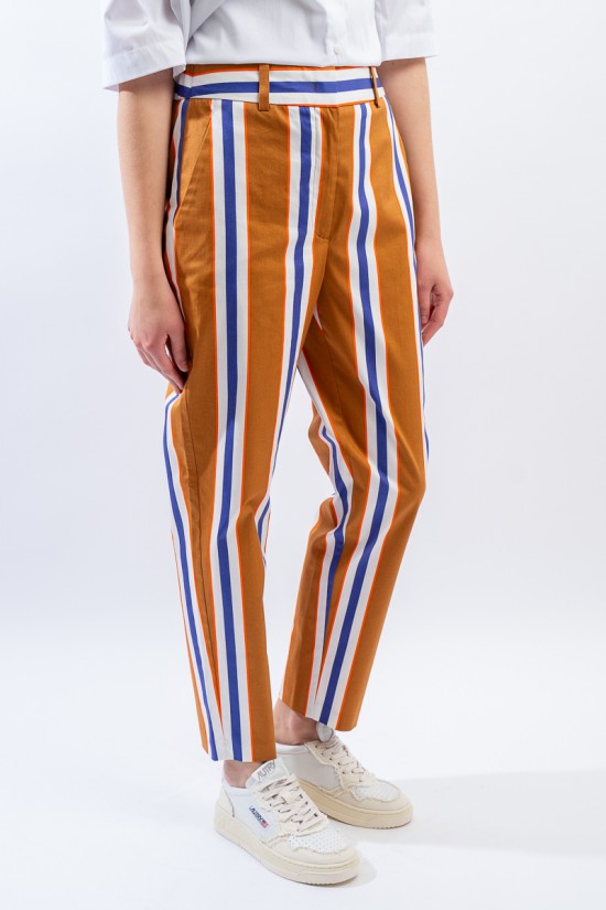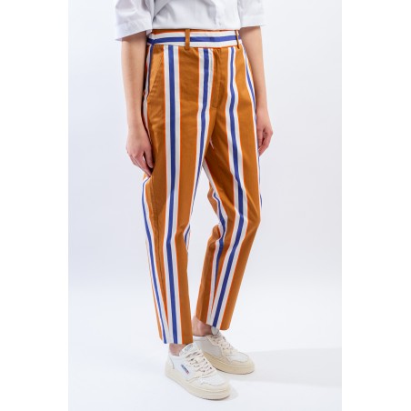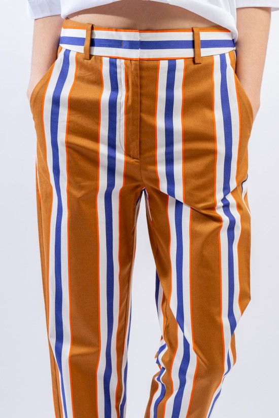 Men's cut Niu trousers made of a cotton blend. It has closure with metal hook, hidden button and zip, French pockets and straight leg. Embellished with a vertical stripe print and a waist strap with belt loops and elastic on the back.