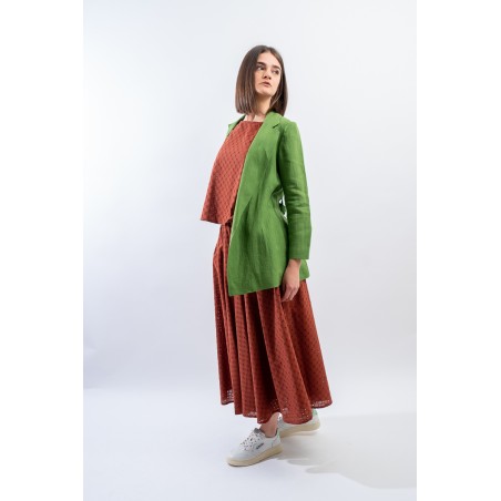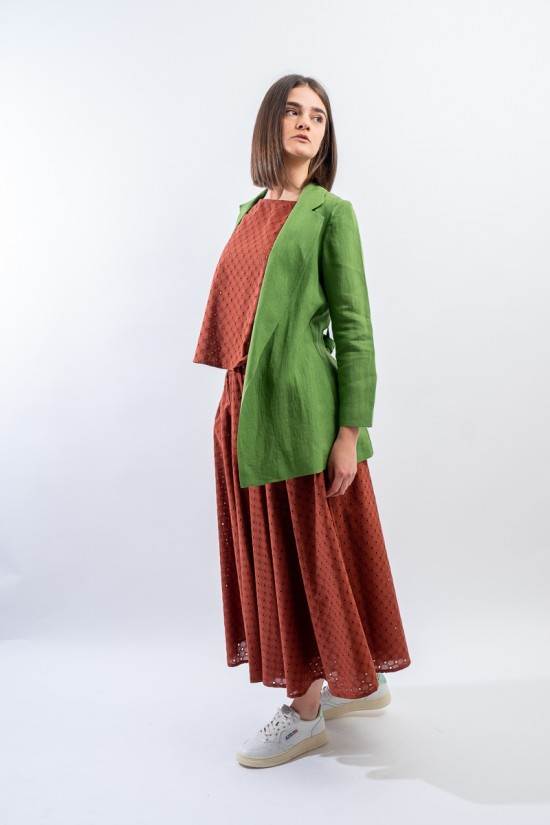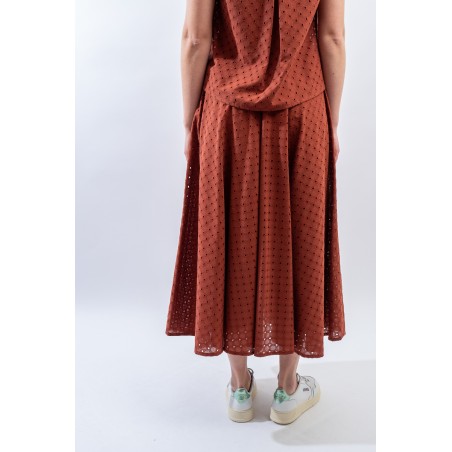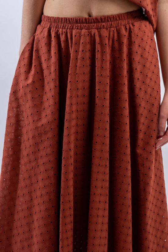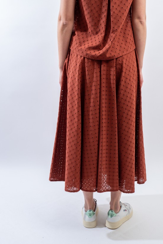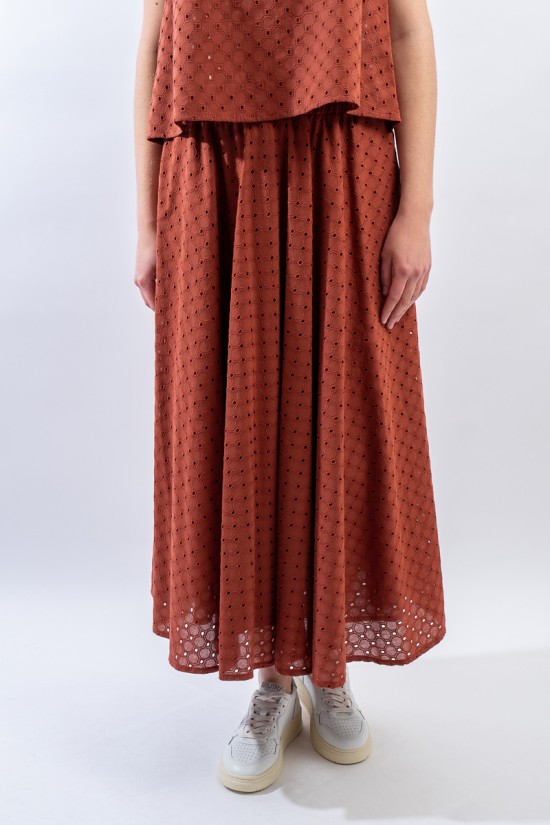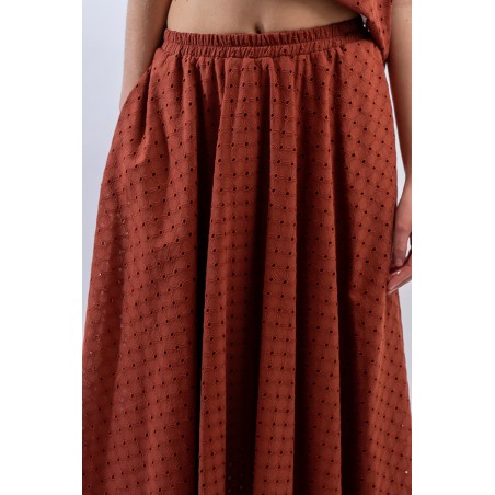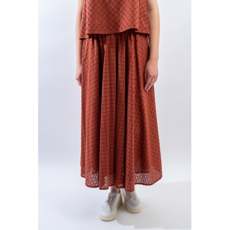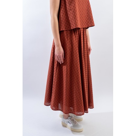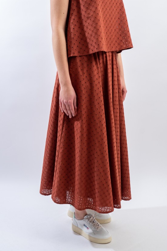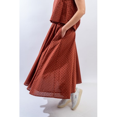 Fresh and comfortable is the long full skirt, made of soft cotton. Featuring an elasticated waistband, broderie anglaise fabric and two open side pockets. A maxi skirt designed to accompany you in any situation thanks to its essentiality and sophistication.