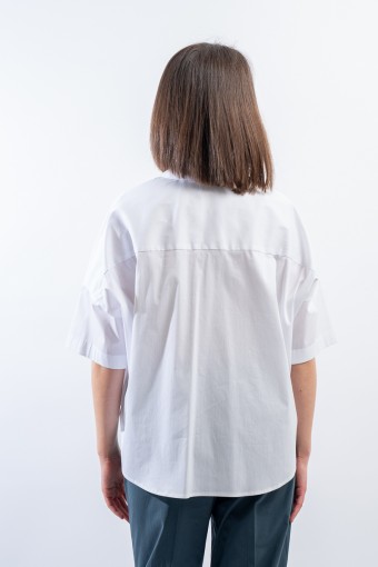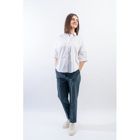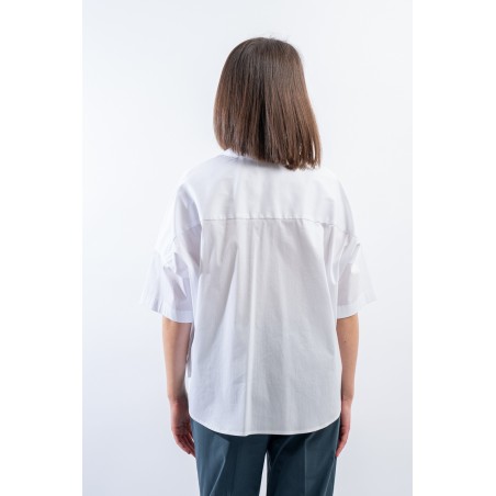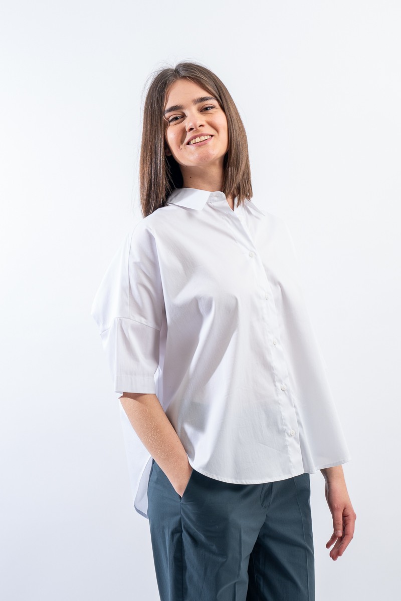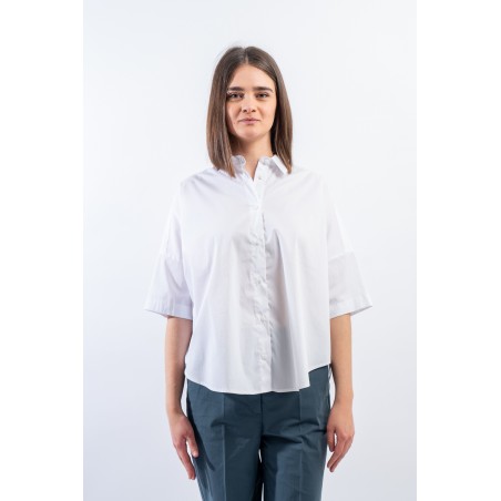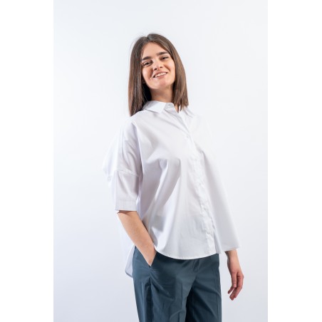 Egg-style shirt made of stretched cotton-blend poplin canvas signed NIU'. Characterized by short sleeves and a classic collar. Visible button closure and slightly flared line.
