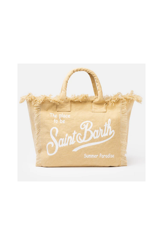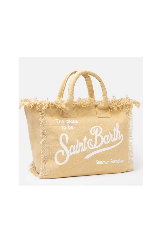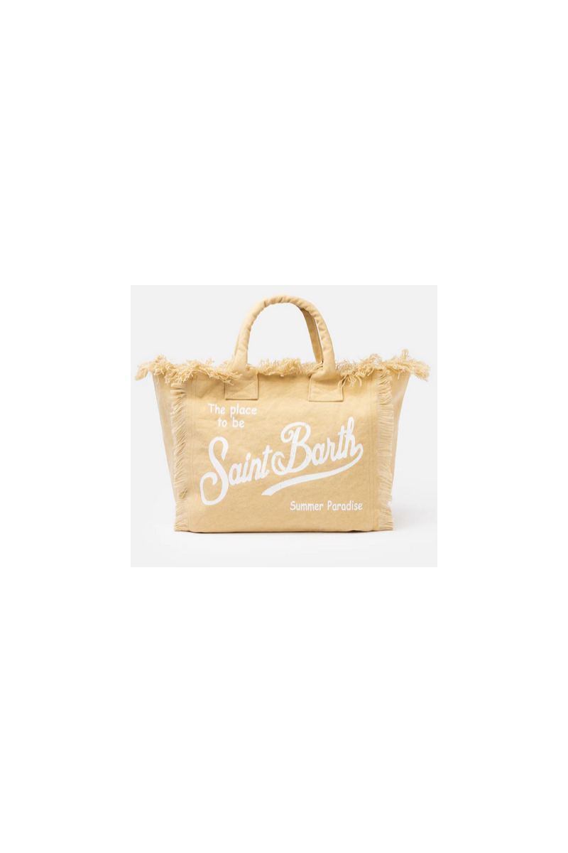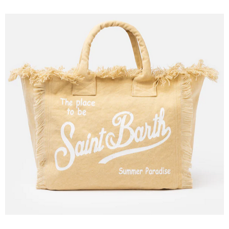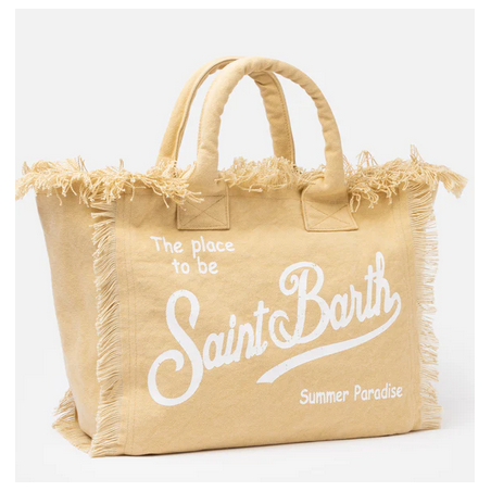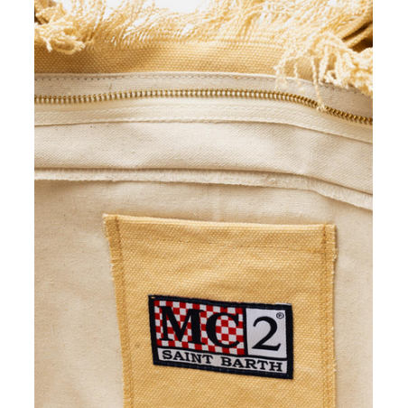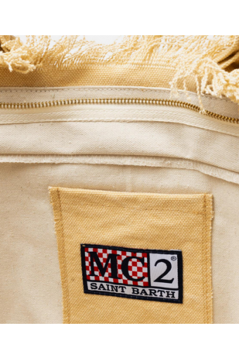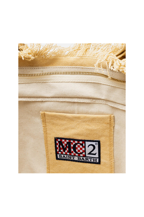Versatile and roomy bag in solid color. Enriched by fringes along the contours, it is made of sturdy cotton canvas, with practical and resistant handles, zip closure and two service pockets. Ideal for any summer day!