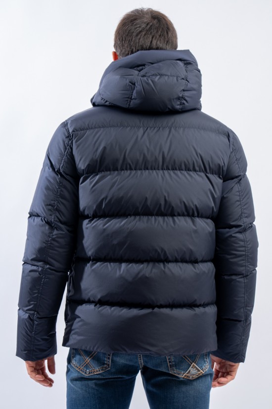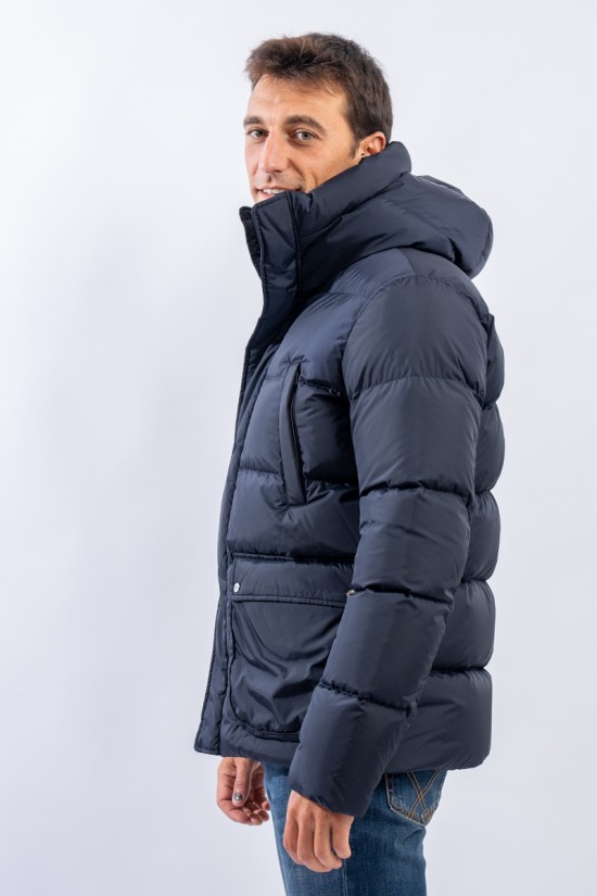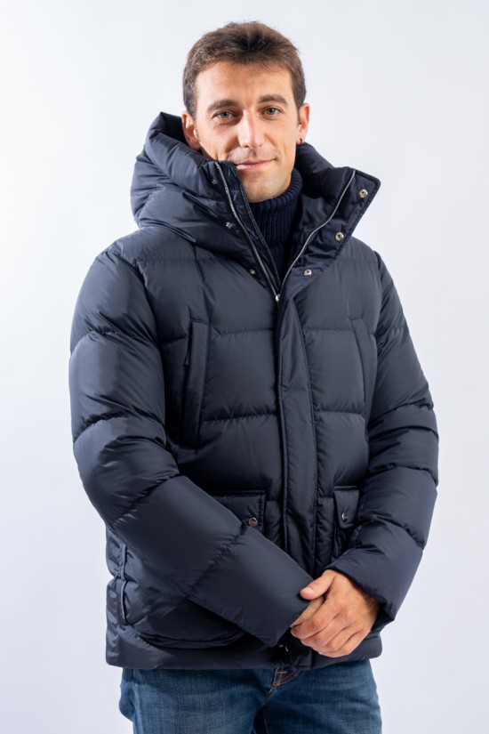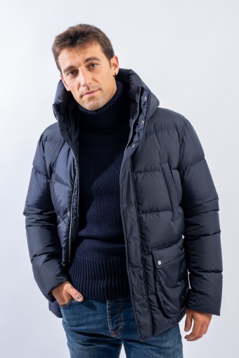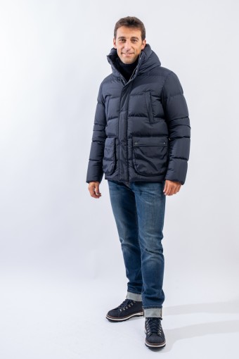 Short down jacket with fixed hood signed HERNO. Made of Chamonix nylon that offers excellent technical performance thanks to the Polar-Tech technology that makes the garment extremely warm, light and water-repellent. Characterized by the numerous pockets on the front and the central closure with double-way zip and press studs. Perfect to be worn in the colder seasons.