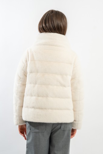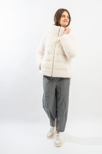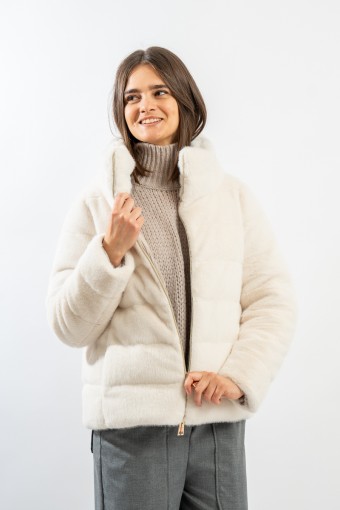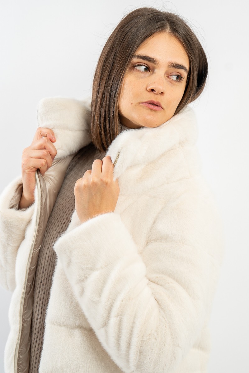 Hood HERNO made of soft faux fur and padded with fine class 1 goose down. The crater collar detail gives a practical and modern touch. Quilted design and slightly flared essential line. Regular fit. Refined and feminine like a fur, warm and comfortable like a down jacket!