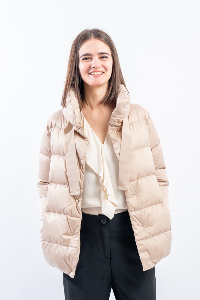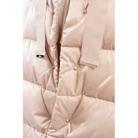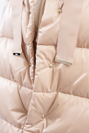 With a chic look, the soft hood by HERNO presents itself. Made of shiny satin-effect nylon and finished with a feather bag that guarantees maximum heat retention. It features a high collar with maxi grosgrain drawstring with a golden logo finish, central closure with logoed buttons and double welt pockets on the sides. Suitable for winter climates to be worn with ease in the mountains and in the city.