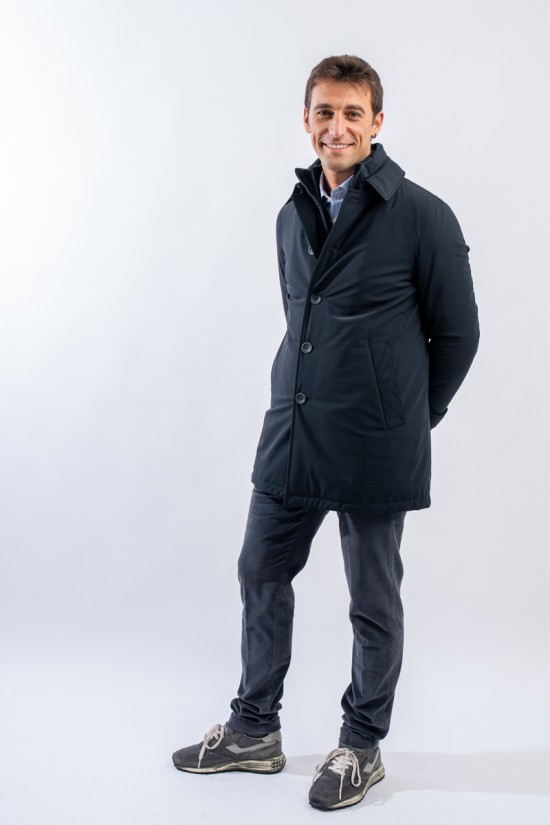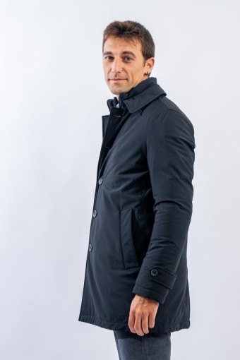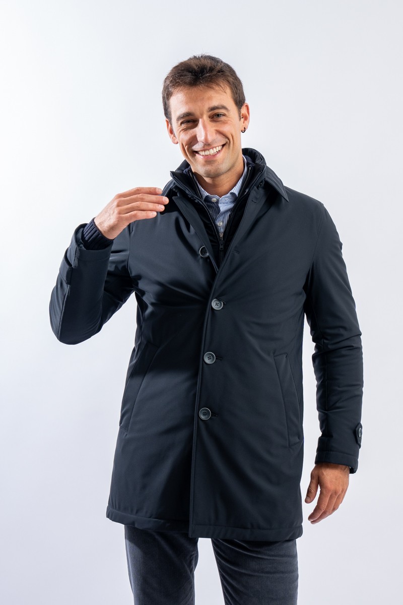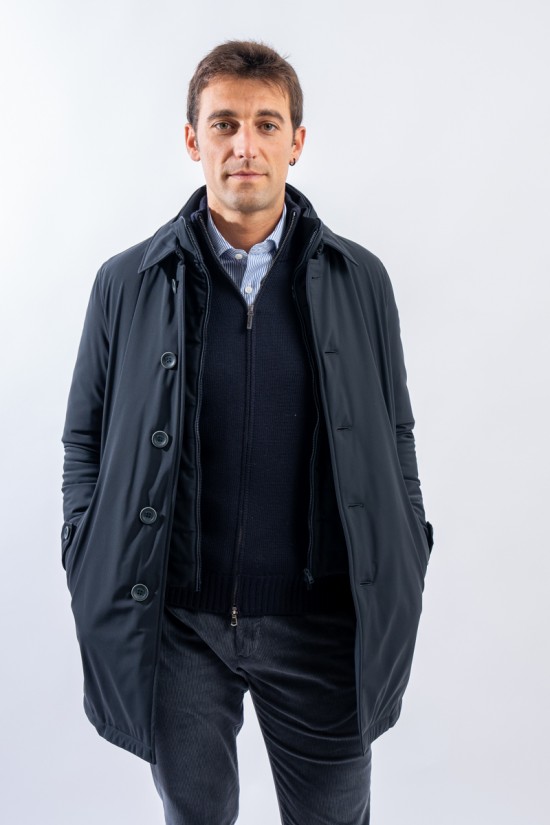 With a refined and essential shape, the medium HERNO down jacket is made of ultra-light dark blue nylon. Characterized by the classic collar and the detail of the logo button on the sleeve. Front closure with logoed buttons. Front embellished with a quilted design with zip.