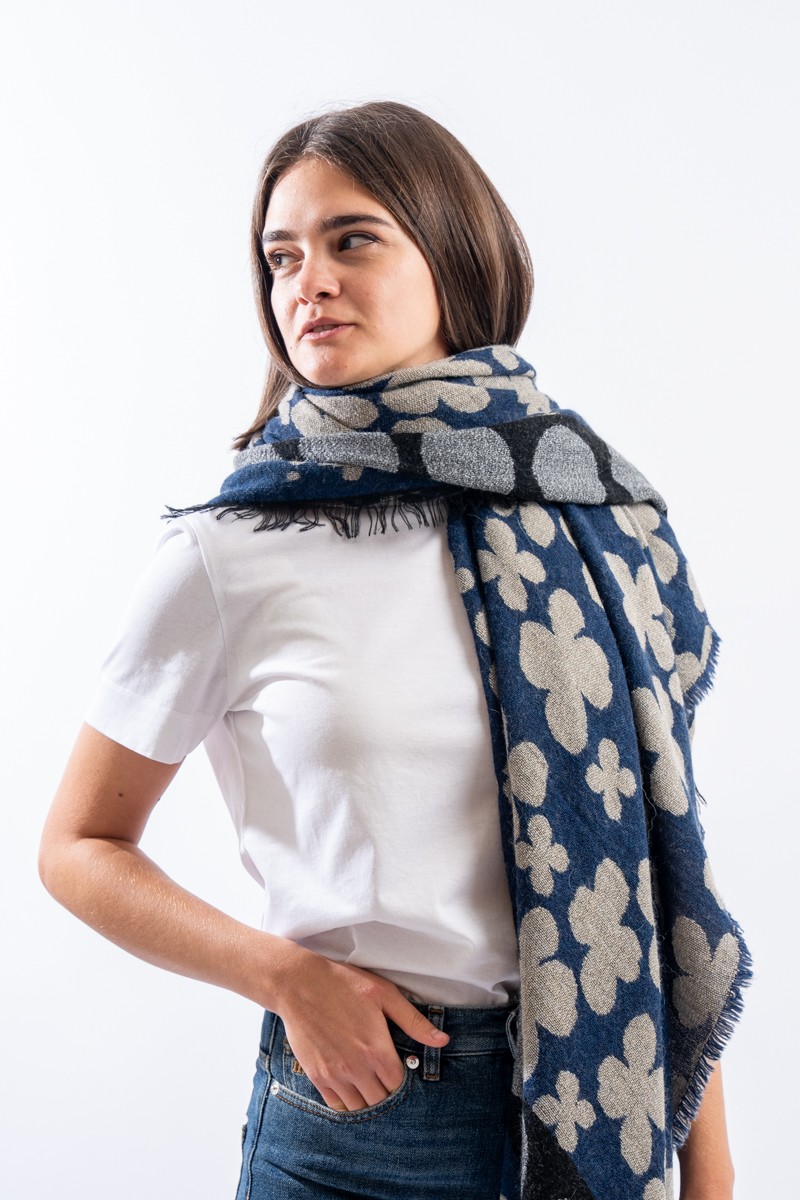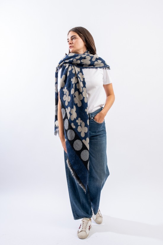 The maxi patterned scarf with frayed details at the ends, signed ALESSIA SANTI, offers a touch of originality and can be an ideal complement to different outfits. The large size makes it very versatile, so you can wear it in various ways, perhaps wrapped around the neck or as a shoulder cover on cooler days.