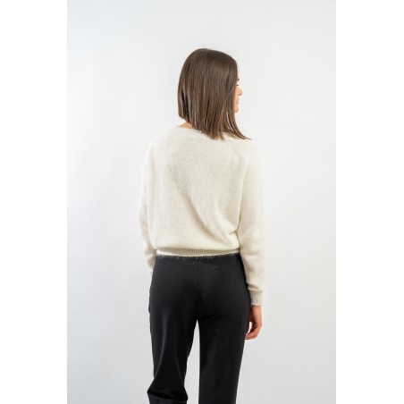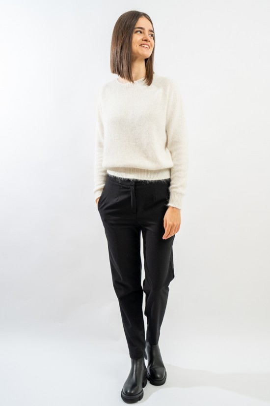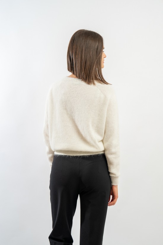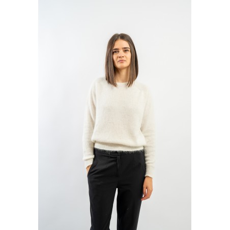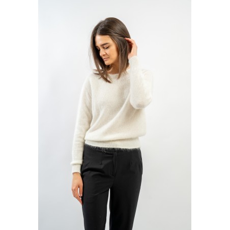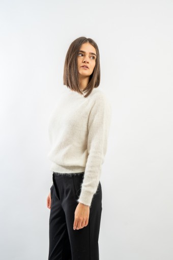 Crewneck sweater with long sleeves made of soft angora extremely soft and warm. Ribbed collar, cuffs and bottom of the shirt. It is a Made in Italy product with a sophisticated artisanal dyeing technique that does not alter the softness of the garment but enhances its colors. The essential lines make this crewneck sweater a very versatile garment to wear the next winter season.