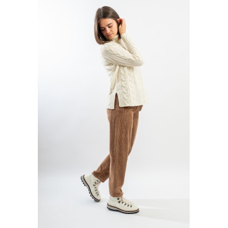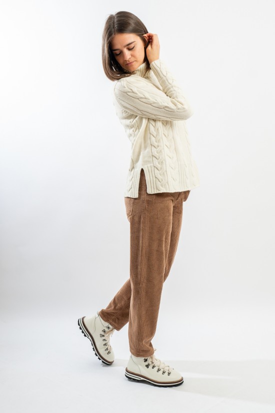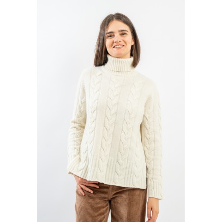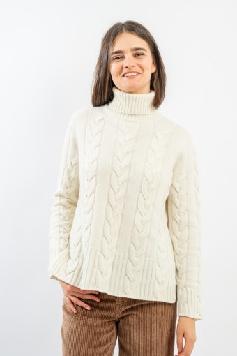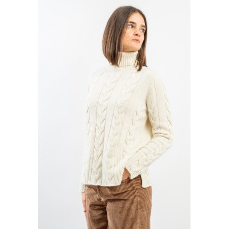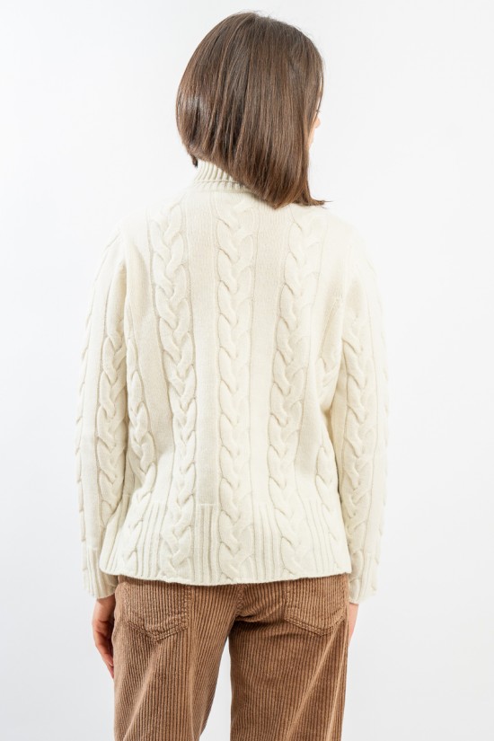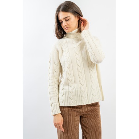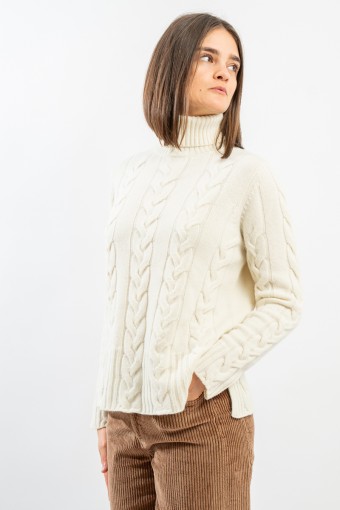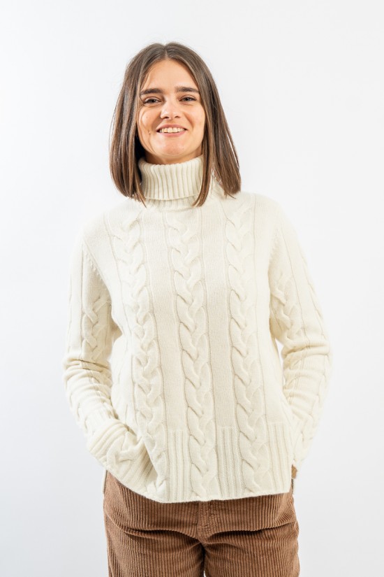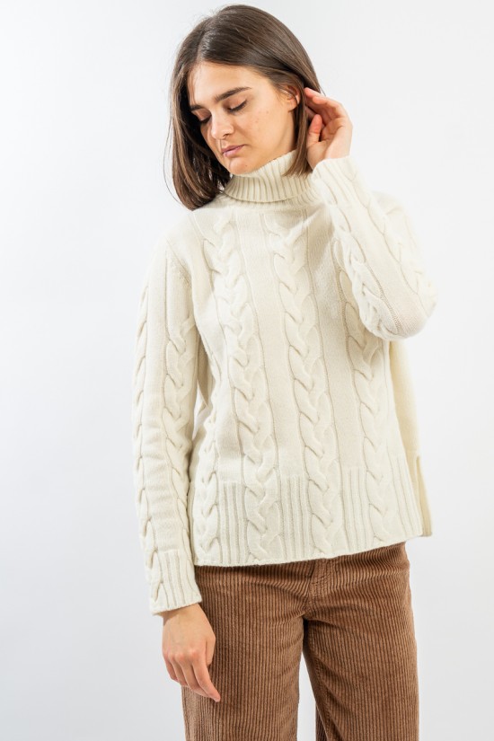 Turtleneck made of fine wool and cashmere yarn. Warm and enveloping. Enriched by the cable-knit alternating with the ribs and finished with side slits.