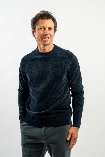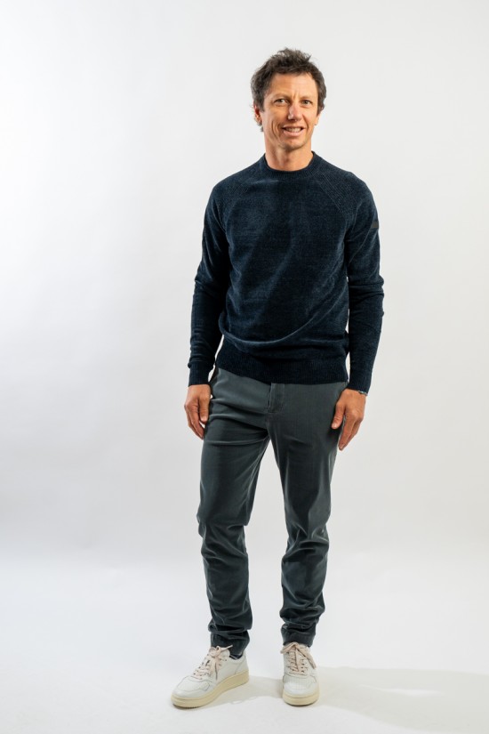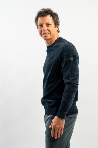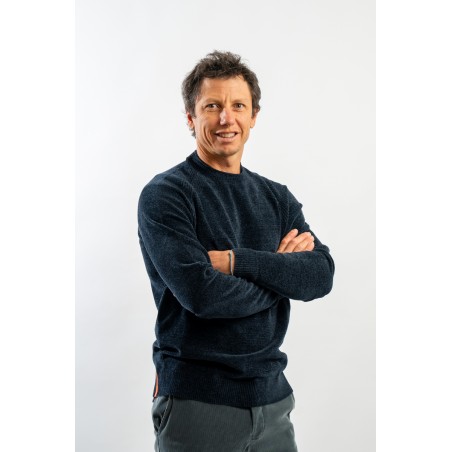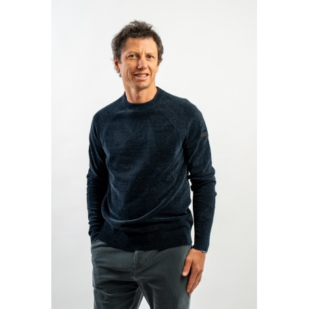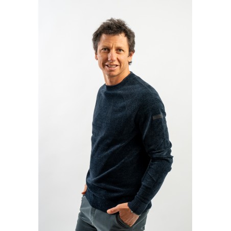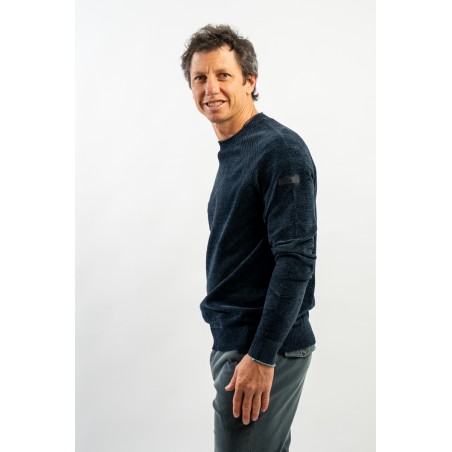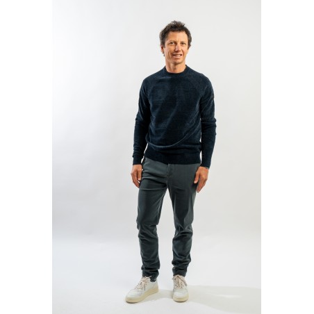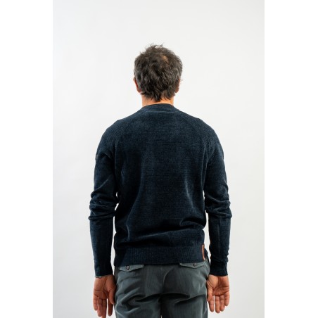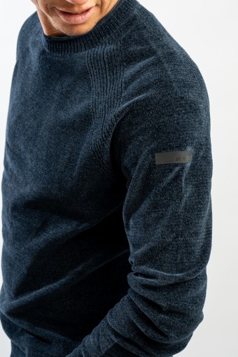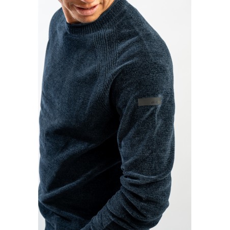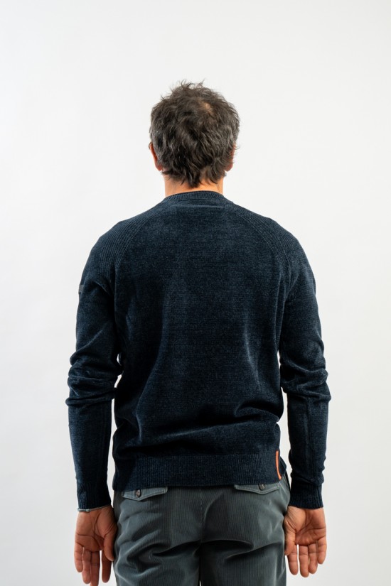 RRD's innovation is also affirmed in the new knitwear proposal. This crewneck sweater is made of soft chenille super stretch and extremely comfortable. The neckline, cuffs and bottom are finished in ribbed. The iconic rubberized logo is applied on the sleeve.