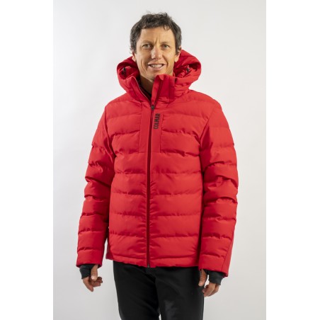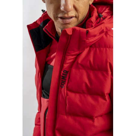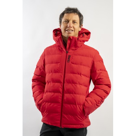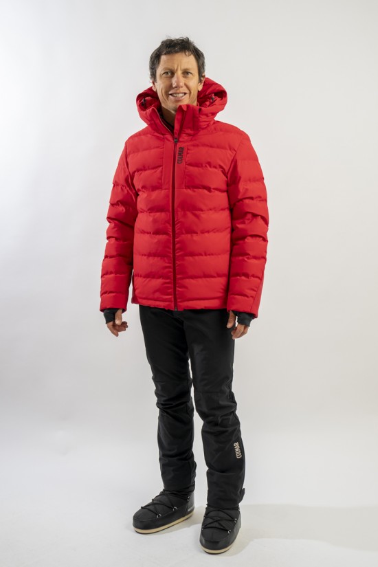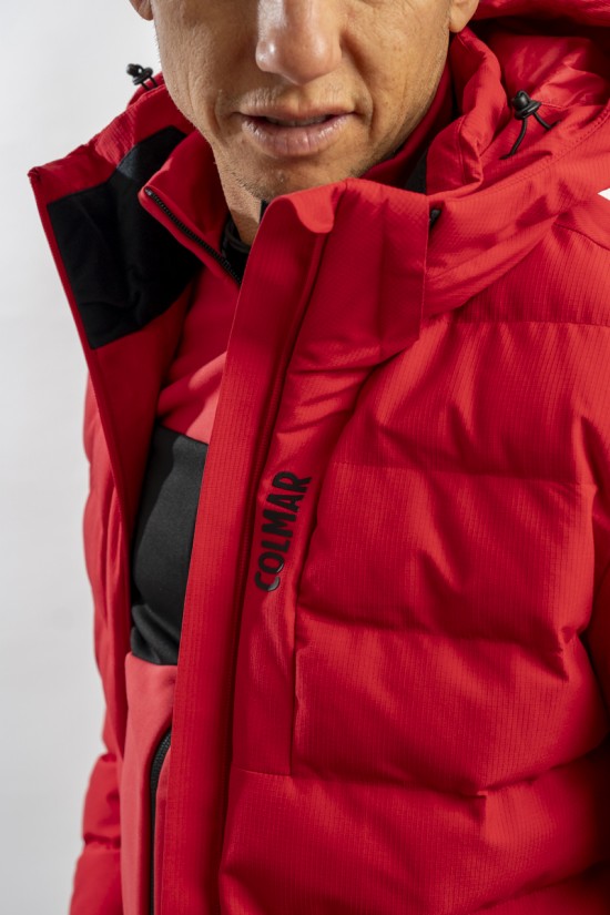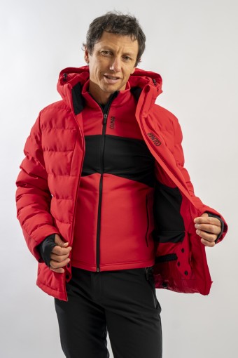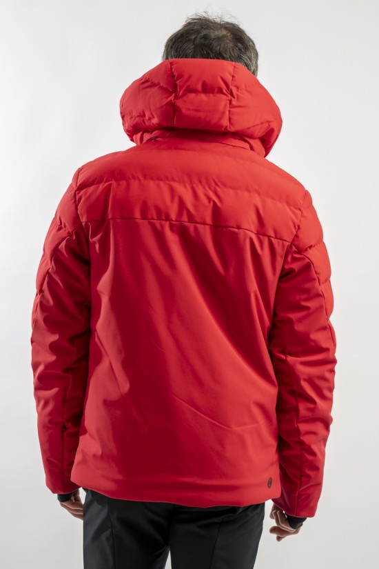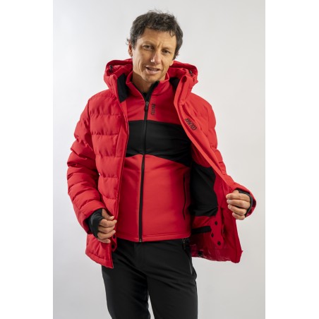 Ski jacket made with a combination of functional materials to make the garment resistant, practical and comfortable in movement. The ripstop nylon with boudine quilting is combined with the smooth stretch softshell fabric part. Regular and slim fit. Padded with two different technical wadding, it ensures breathability in the necessary points and the right insulation. The hood is enveloping and detachable so that the garment can be adapted to all weather conditions.