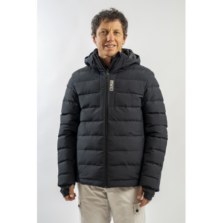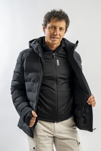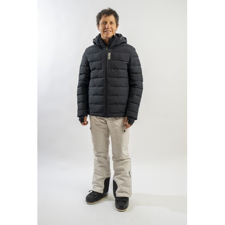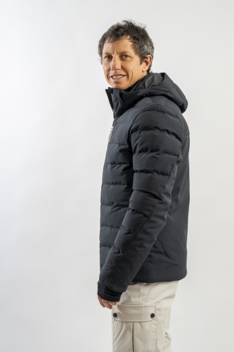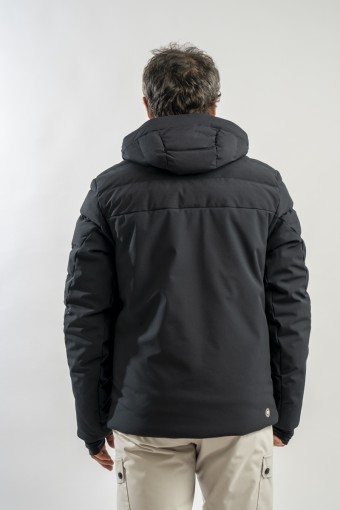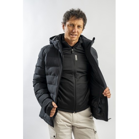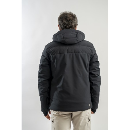 Ski jacket made with a combination of functional materials to make the garment resistant, practical and comfortable in movement. The ripstop nylon with boudine quilting is combined with the smooth stretch softshell fabric part. Regular and slim fit. Padded with two different technical wadding, it ensures breathability in the necessary points and the right insulation. The hood is enveloping and detachable so that the garment can be adapted to all weather conditions.
