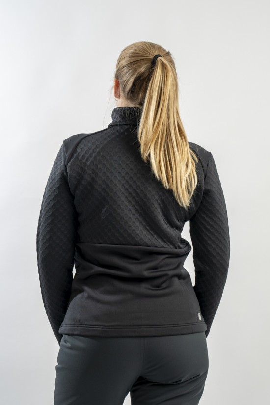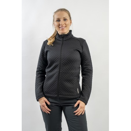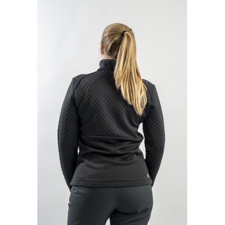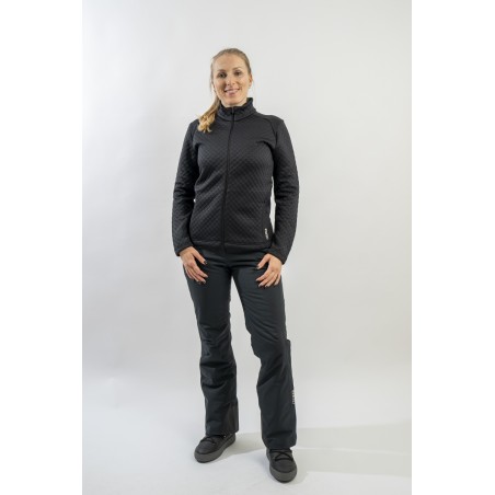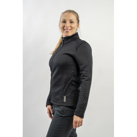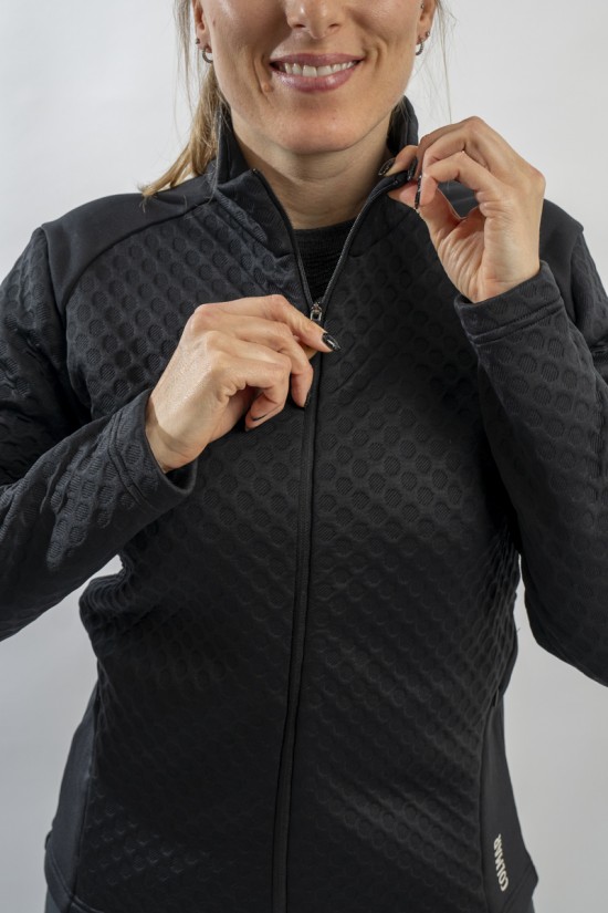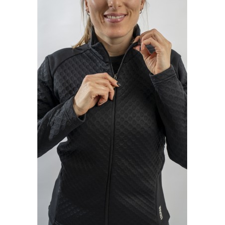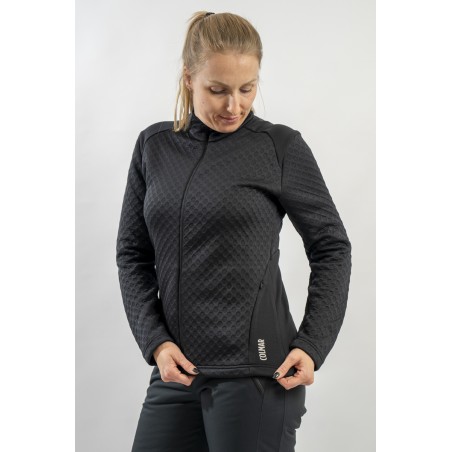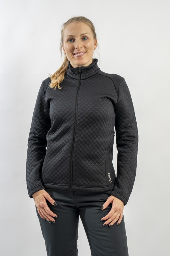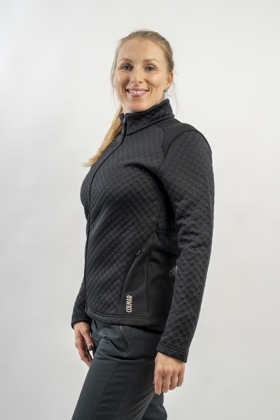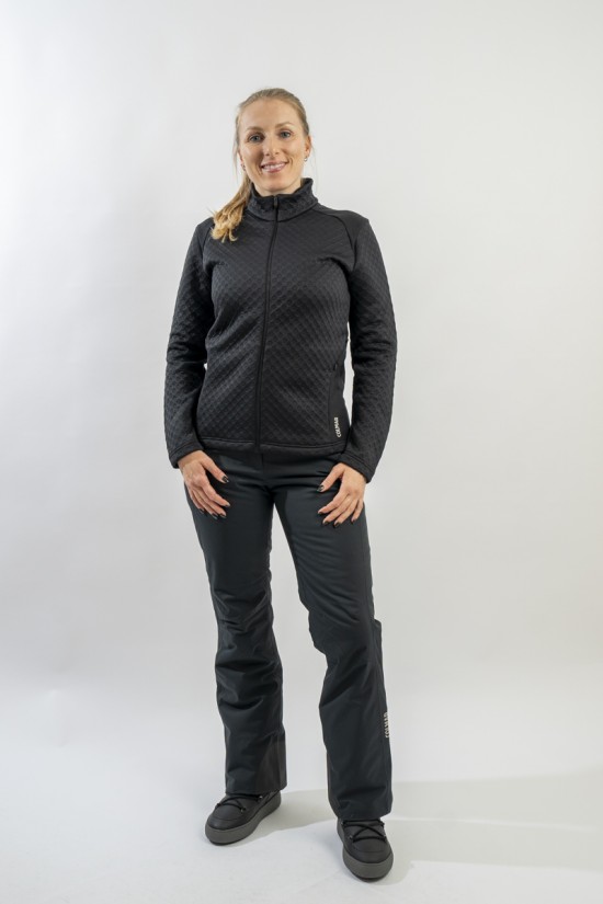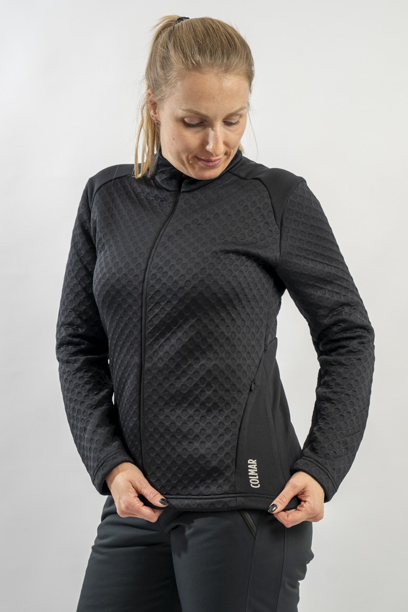 Full-zip undersuit made of stretch and breathable fabric. Soft fleece lined on the shoulders and back, to keep the most exposed areas warmer. Characterized by the particular geometric workmanship on the front and equipped with two practical pockets closed with welt zip. Compact and lightweight, it is perfect under the ski jacket or for practicing any outdoor sport.