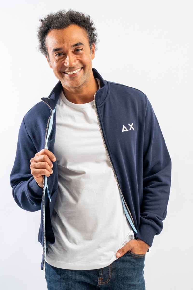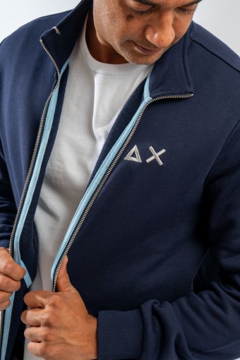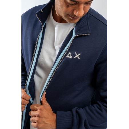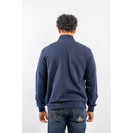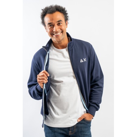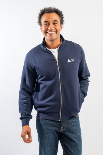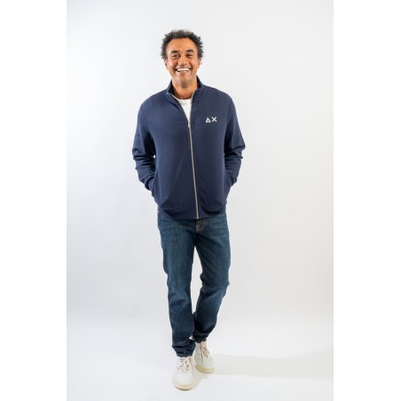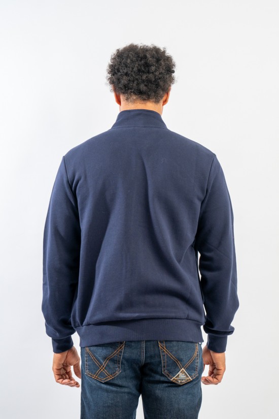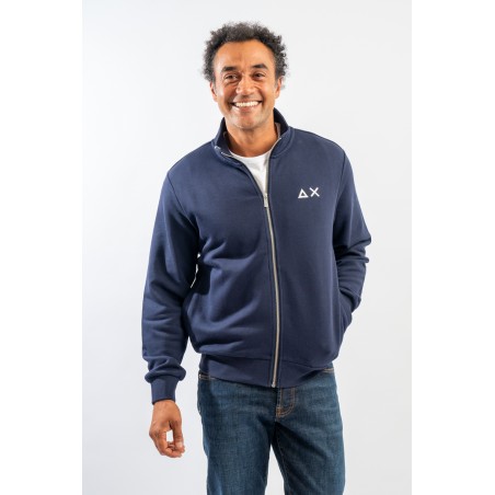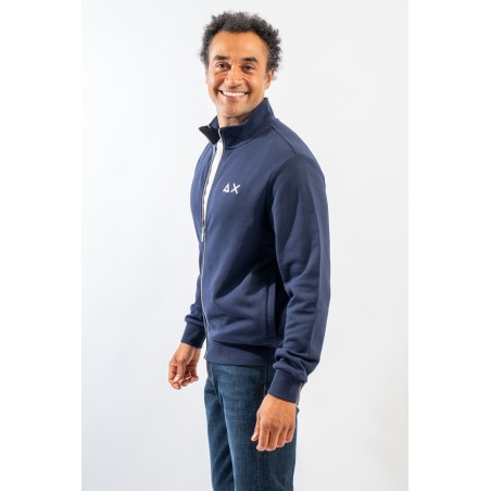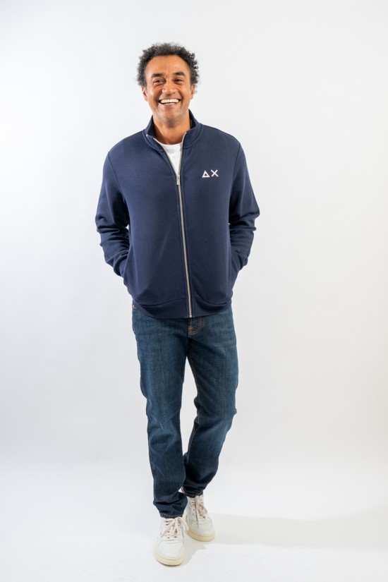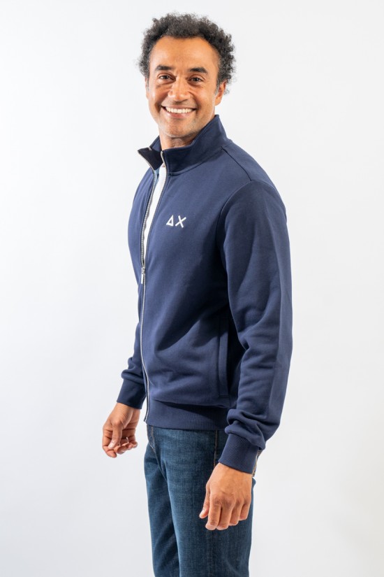 Stand-up collar sweatshirt made of cotton fleece on the inside. Main closure with metal zip and two practical side pockets closed with hidden zip. Ribbed collar, cuffs and hem.