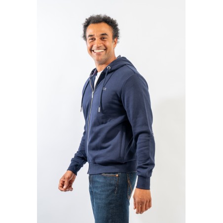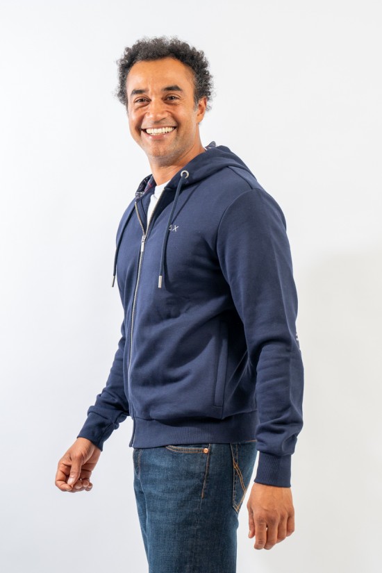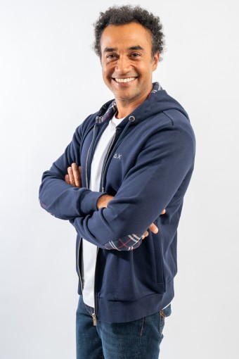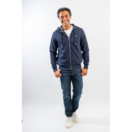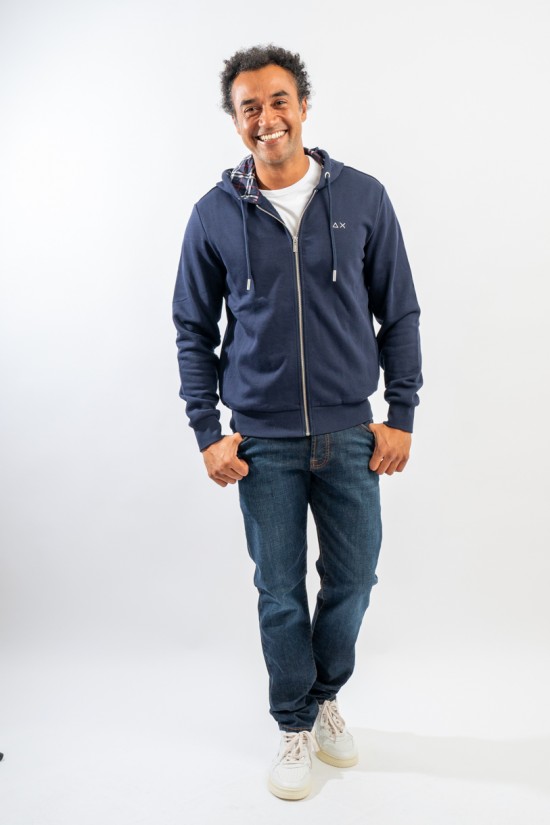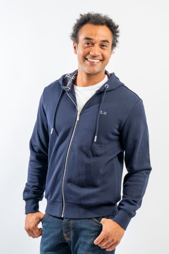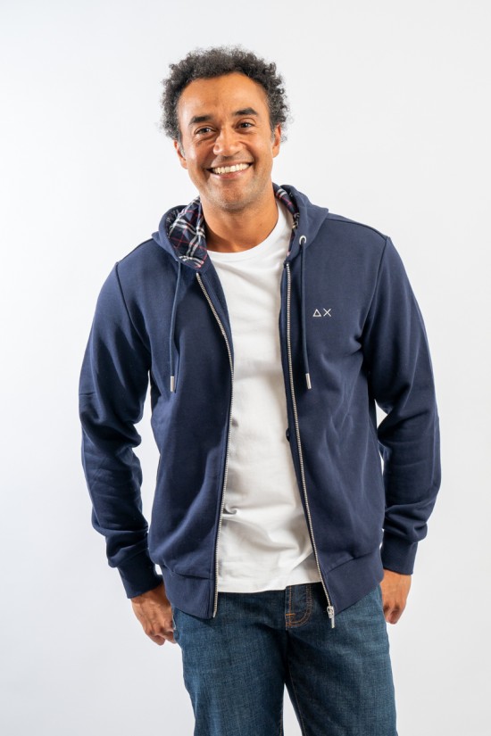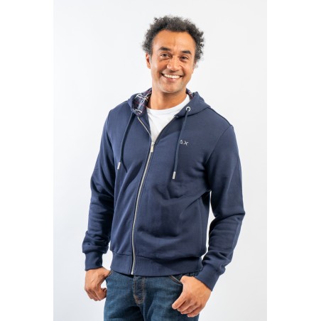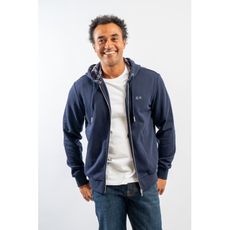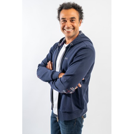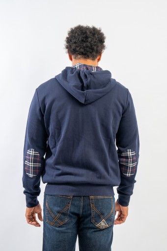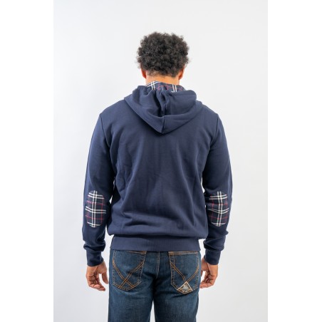 Full-zip hooded sweatshirt made of fleece cotton. Enriched by the check pattern fabric inserted inside the hood and as a patch on the elbows. Complete with two practical side straps closed with hidden zip. Finished with ribbed knitting at the bottom and cuffs.