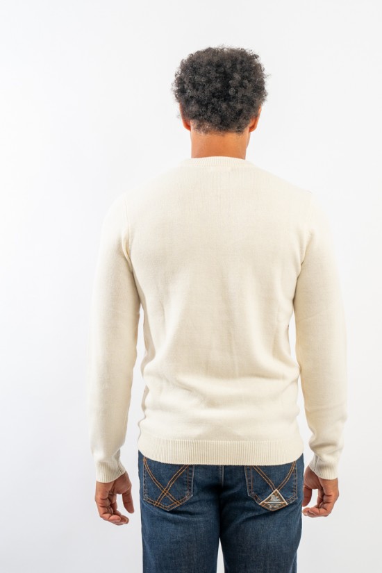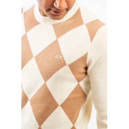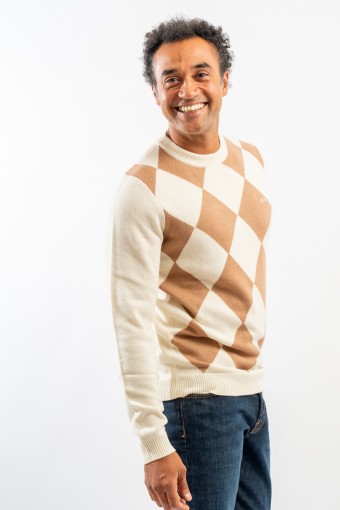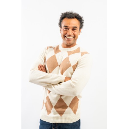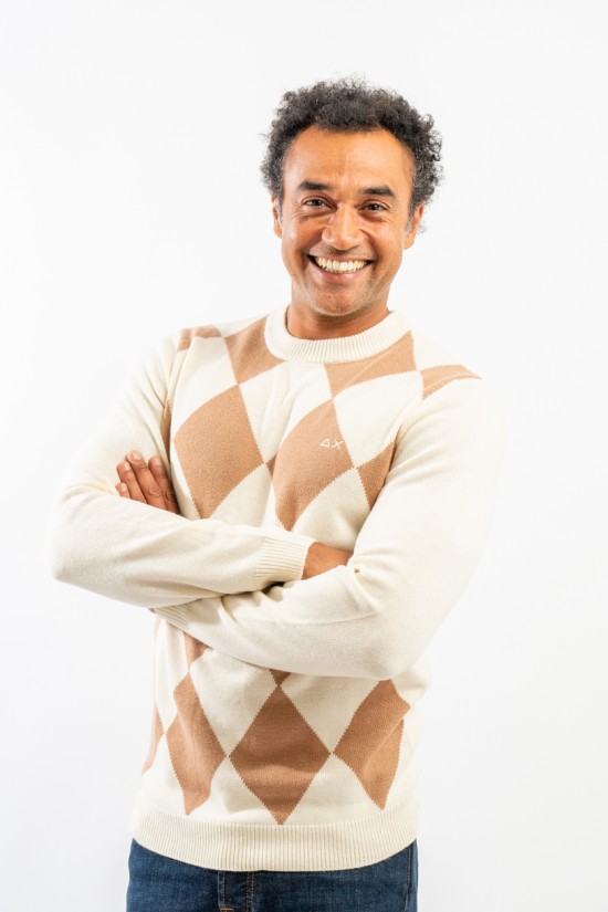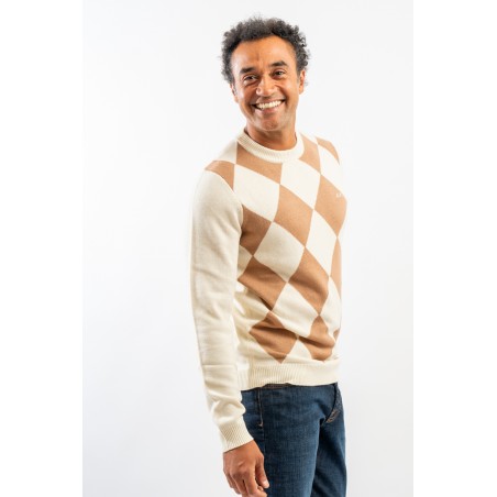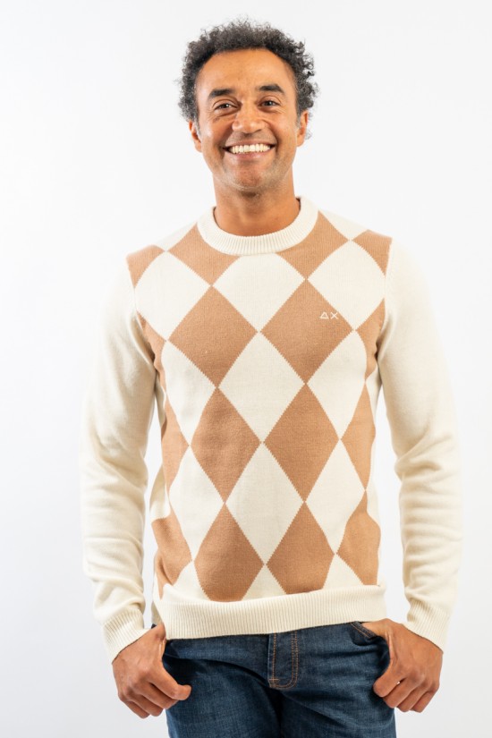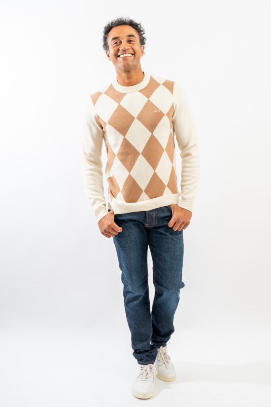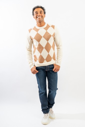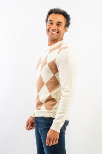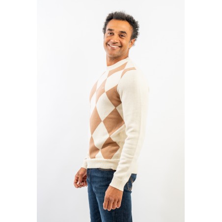 Crewneck sweater made of merino wool and cashmere blend. Enriched by the two-tone diamond pattern on the front. Ribbed finish on the neckline, cuffs and hem. Regular fit
