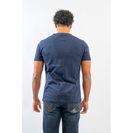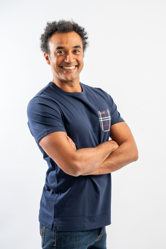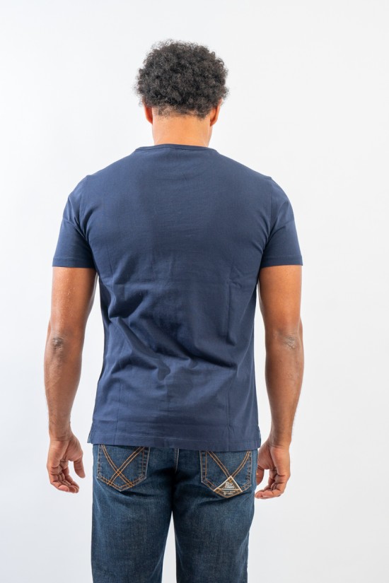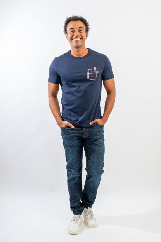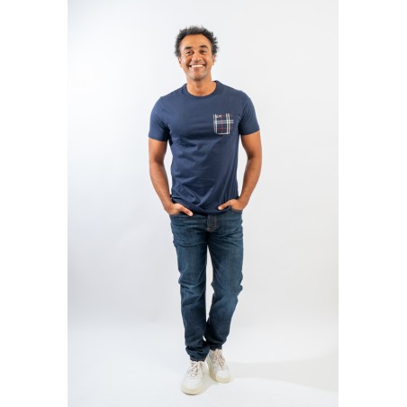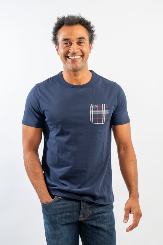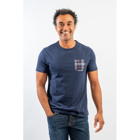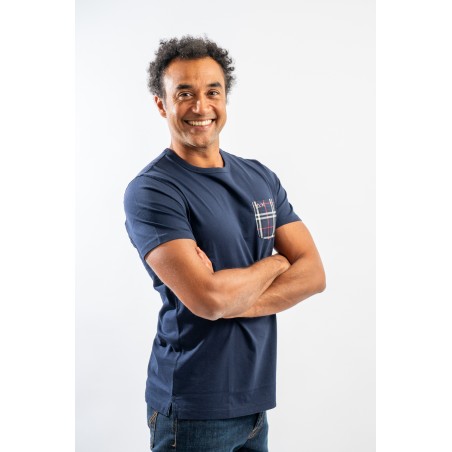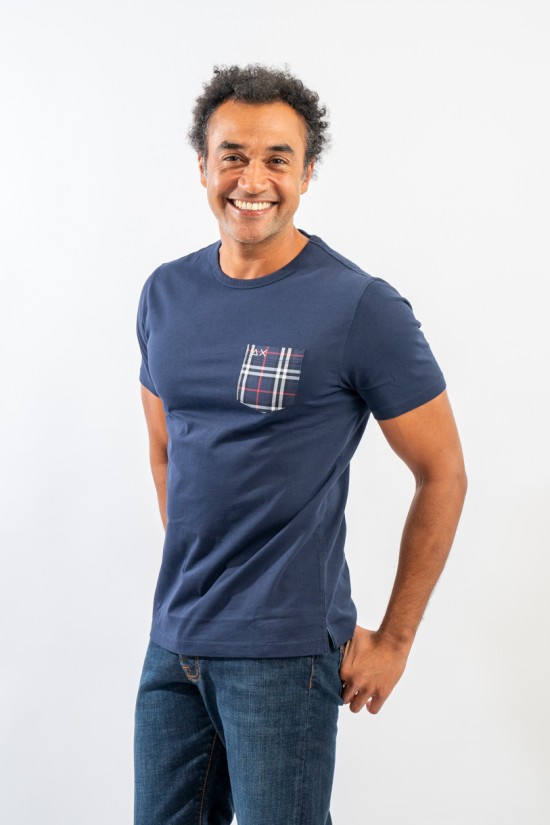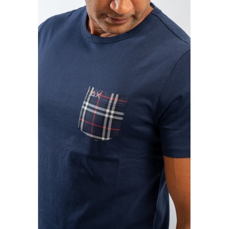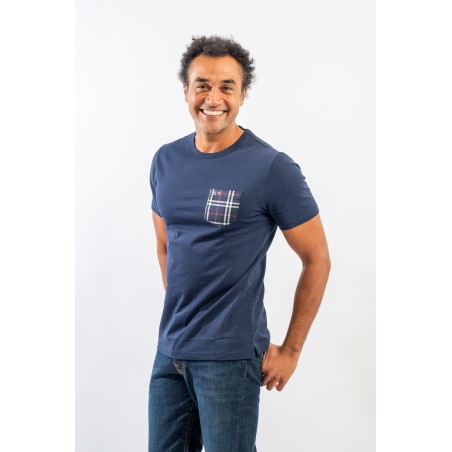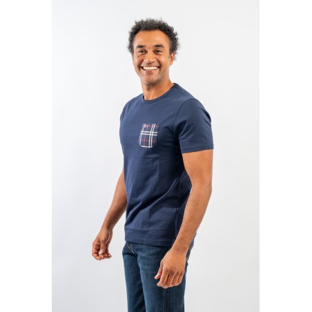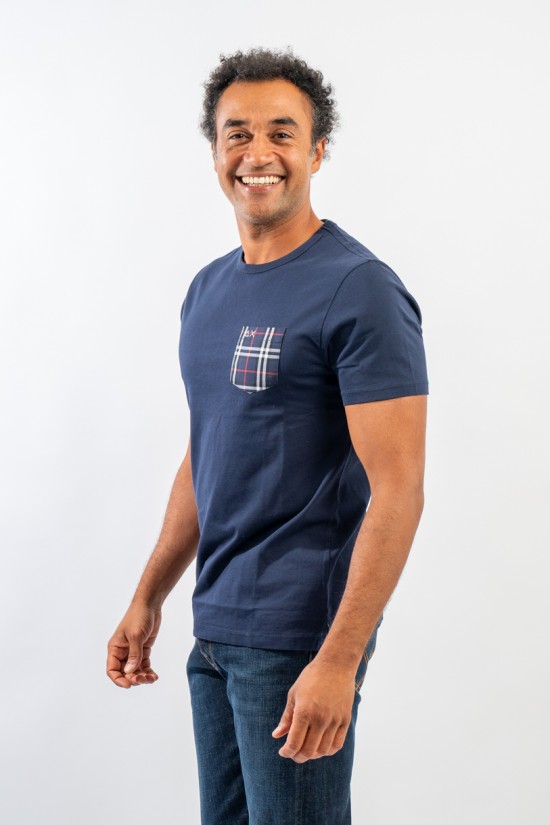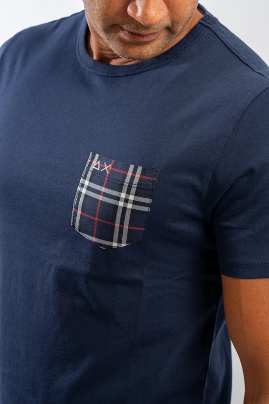 Crewneck T-shirt made of cotton. Ribbed neckline and side slits at the bottom. Enriched by the chest patch pocket with check pattern.