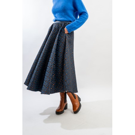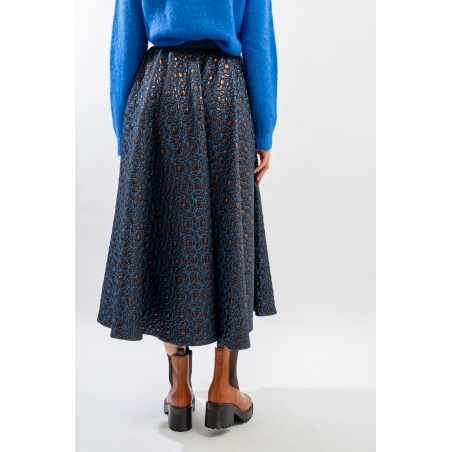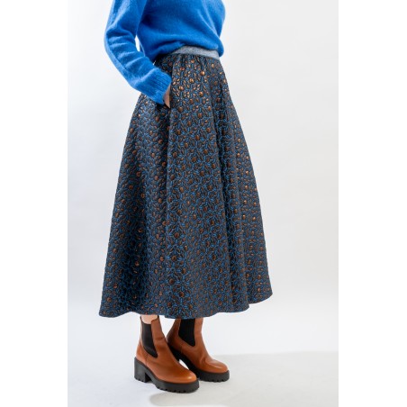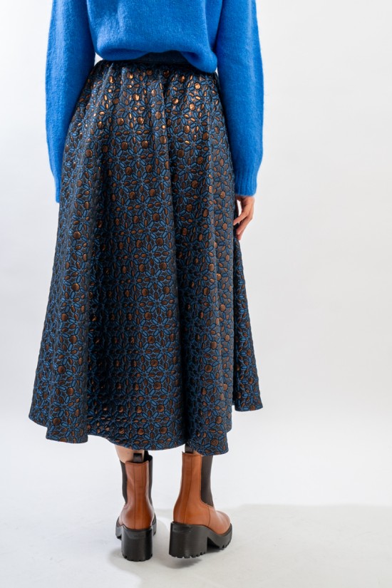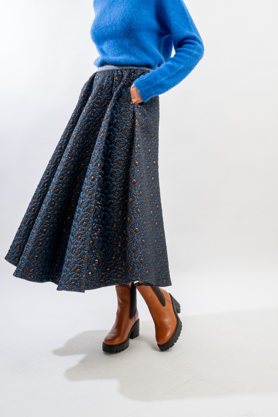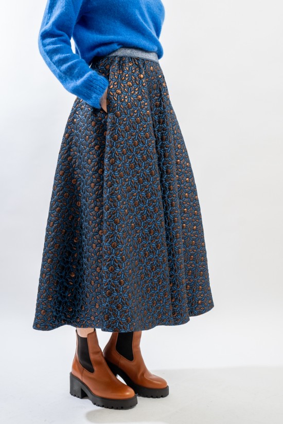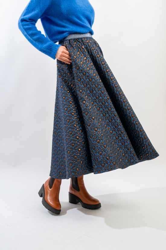 Refined long skirt made of jacquard fabric with lurex inserts, designed NIU'. It has a practical elastic waistband and side welt pockets. Embellished with an all-over floral pattern. Perfect to wear with a sweater or with its matching bolero.