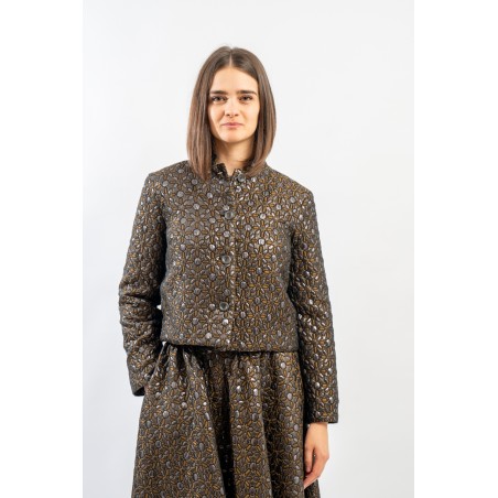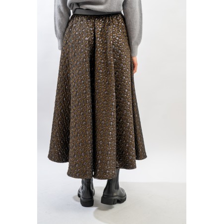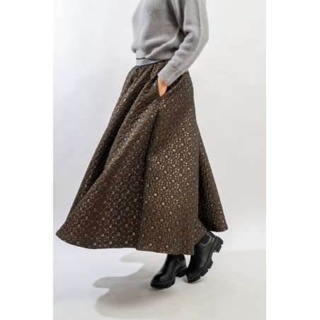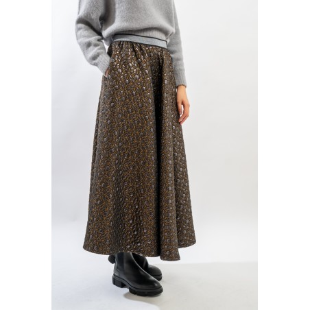 Refined long skirt made of jacquard fabric with lurex inserts, designed NIU'. It has a practical elastic waistband and side welt pockets. Embellished with an all-over floral pattern. Perfect to wear with a sweater or with its matching bolero.
