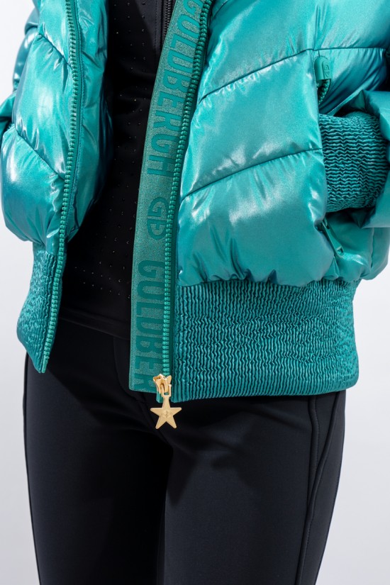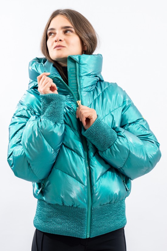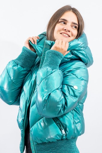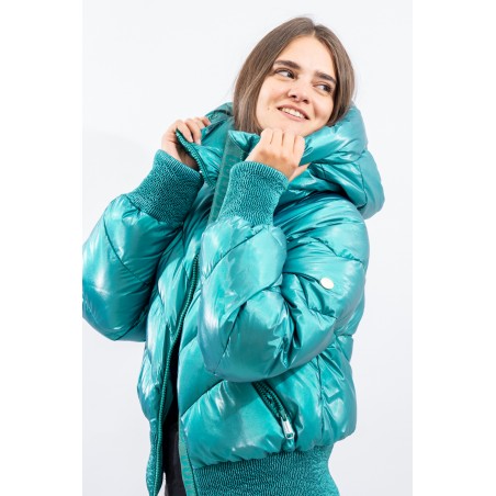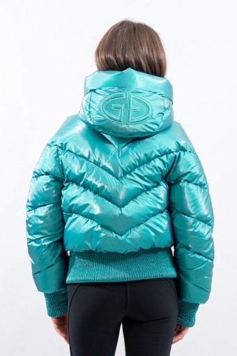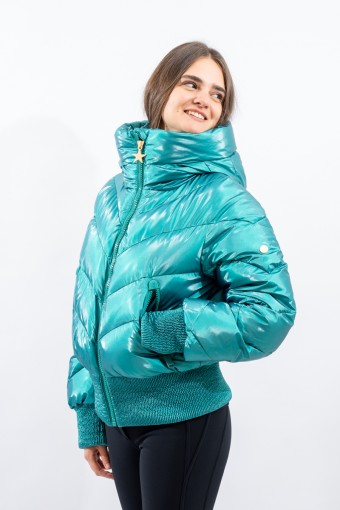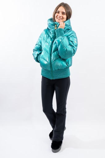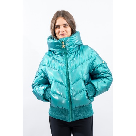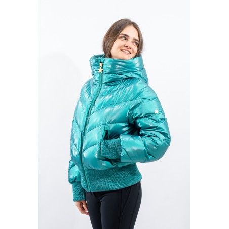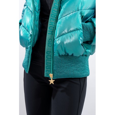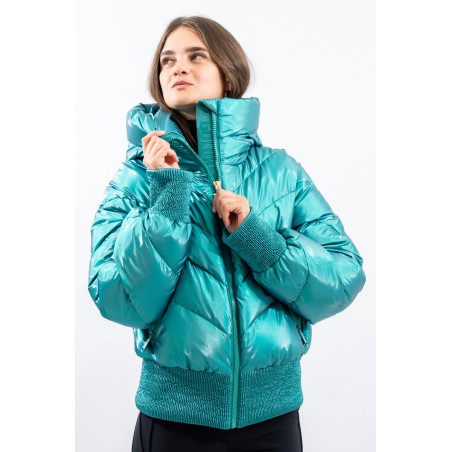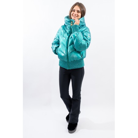 Padded with goose down and characterized by the "puffy" design, young and contemporary. The outer fabric, a soft satin nylon with a metallic effect, is enriched by diagonal boudine quilting, for a unique and original play of light and volumes. Bomber jacket enhanced by the embossed stretch fabric band at the bottom for perfect adherence and greater protection from atmospheric agents. The padded sleeves are complete with windproof cuffs and embossed elastic edging to emphasize the desired effect. Versatile and contemporary, it is the ideal garment on the snow and beyond.