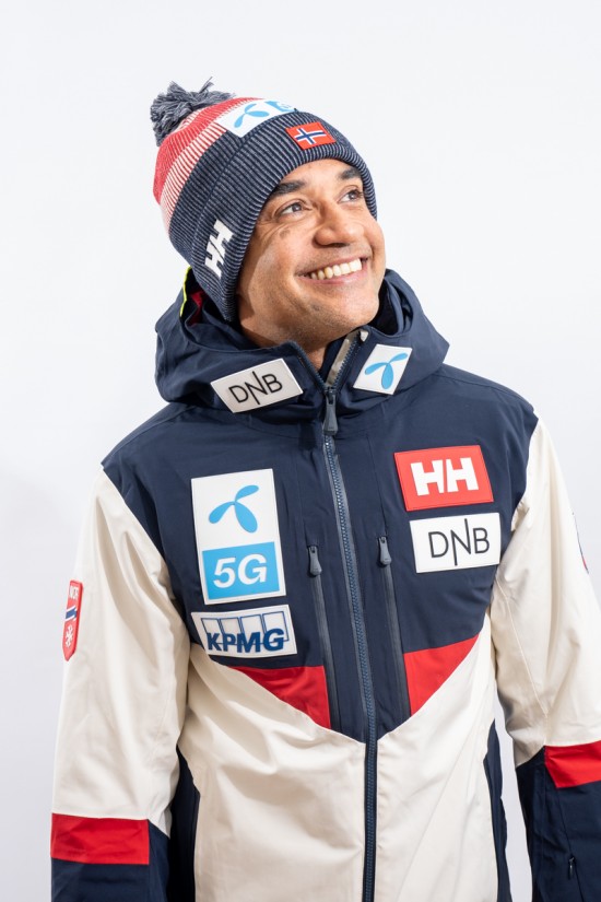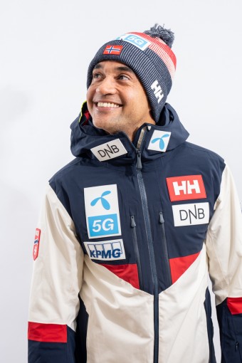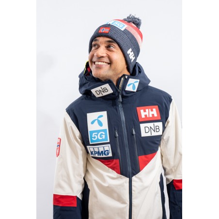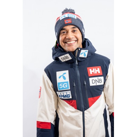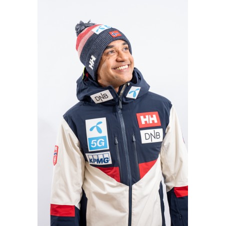 Beanie with pom-pom inspired by the Norwegian national alpine ski team, on the front it bears the patches of the team sponsors. Made of recycled polyester and ribbed in contrasting color with cuff at the hem and pompoms.