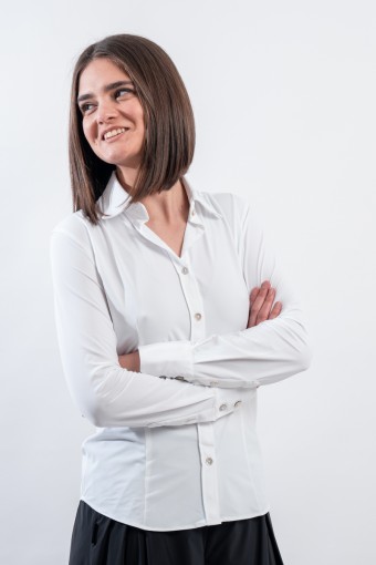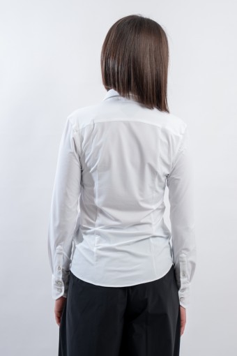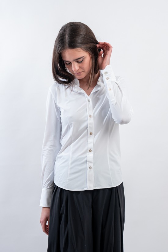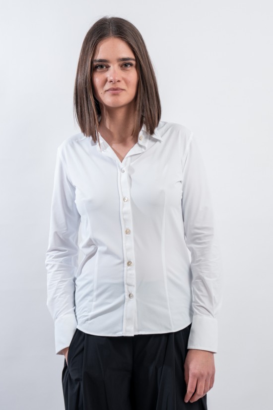Shirt made of exclusive Oxford stretch fabric, fresh, breathable and pleasant to the touch, for unparalleled comfort and fit. It is a reinterpretation of the classic men's model reinterpreted with a touch of contemporary femininity given by the delicate sidecut that enhances the waistline. The model is characterized by the classic mother-of-pearl buttoning that gives it a touch of understated elegance. Versatile and sophisticated, it is perfect in the office or to enhance the most casual look.