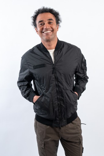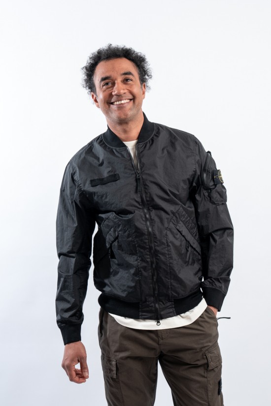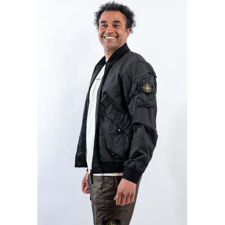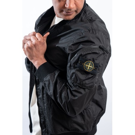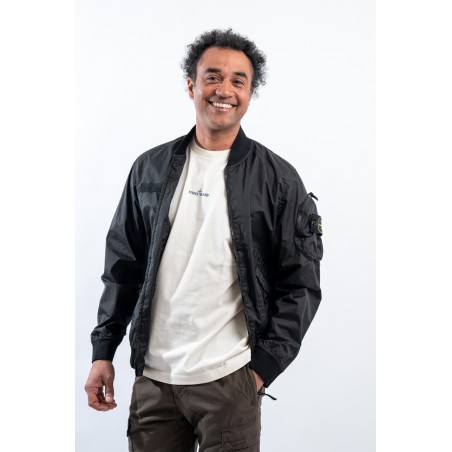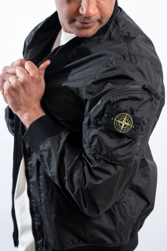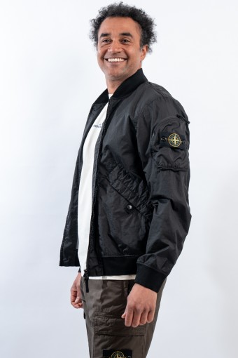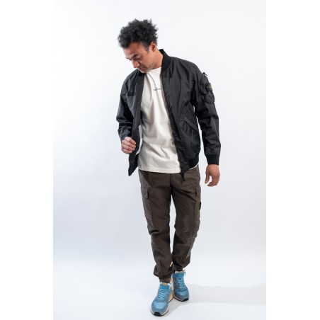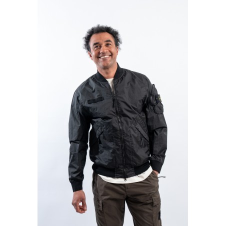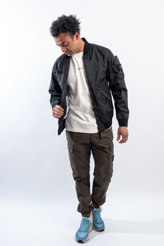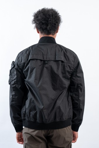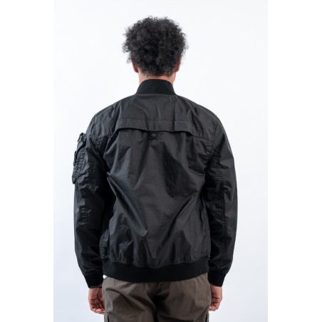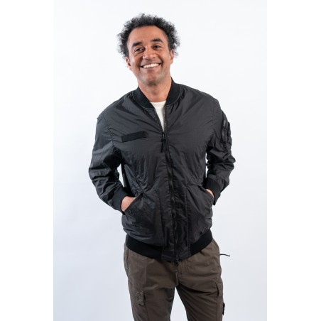 Bomber jacket made of lightweight three-layer technical fabric laminated to a breathable and water-repellent membrane, finished with a matte and contemporary look in the lines. The garment dyeing gives it an exceptional color without affecting the performance characteristics of the fabric. Collar, bottom and cuffs are finished with elasticated ribs for greater grip and comfort. Two side pockets complete the look and a zipped pocket on the sleeve gives it an extra touch of character enriched by the iconic institutional patch.