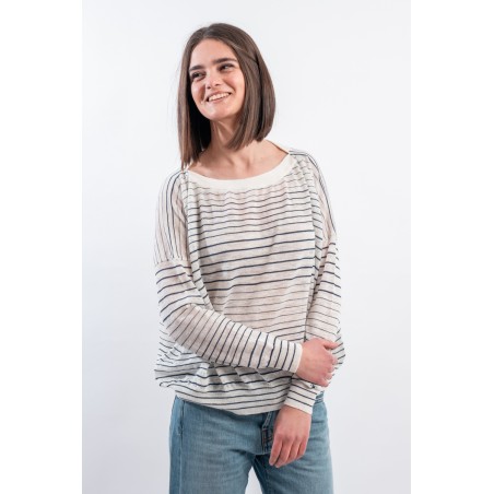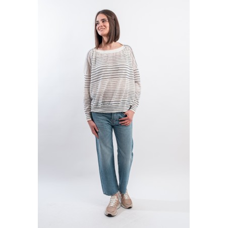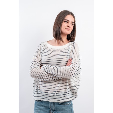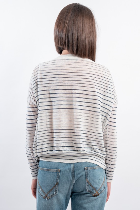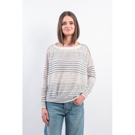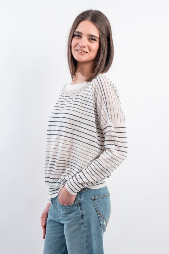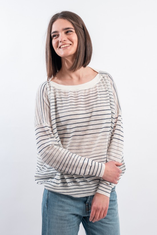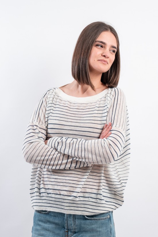 Boat neckline sweater with thin stripe by ROBERTO COLLINA made of very light slub linen. Long sleeves with dropped shoulder and ribbed collar. Boxy cut. Made in Italy.