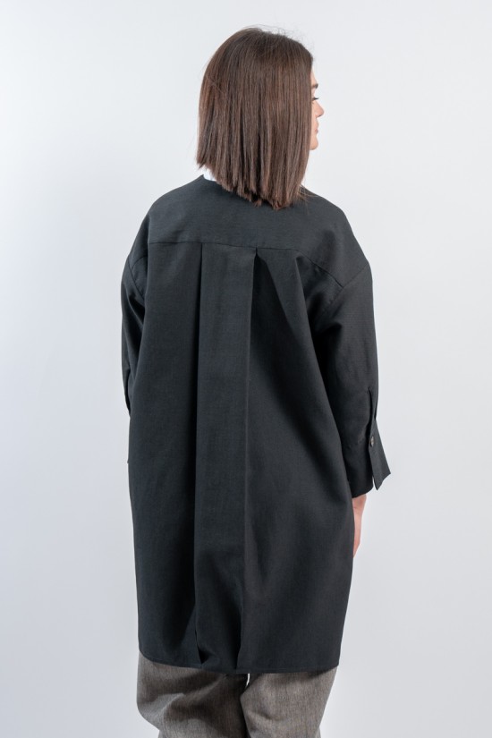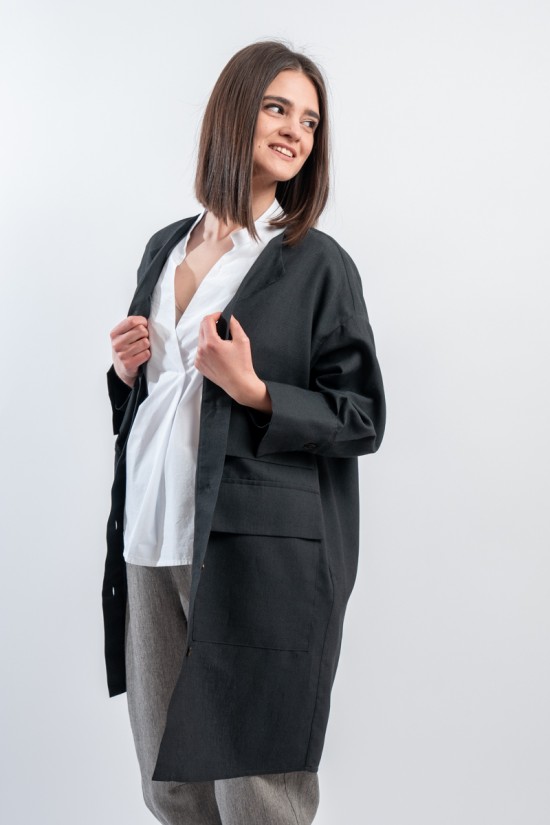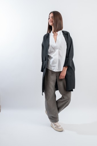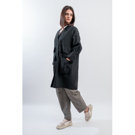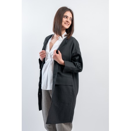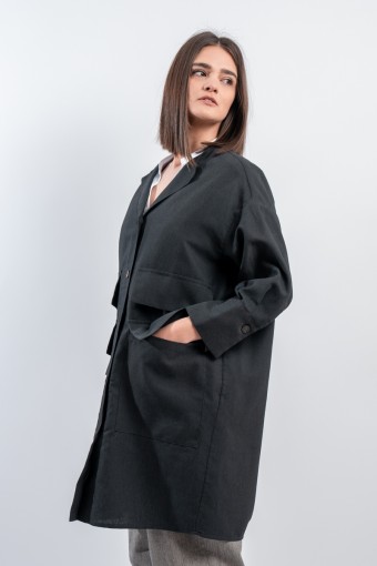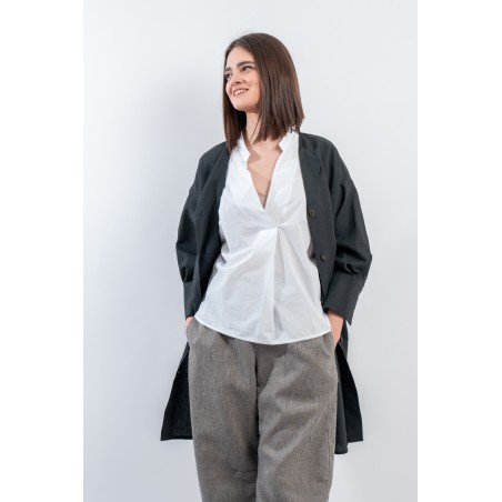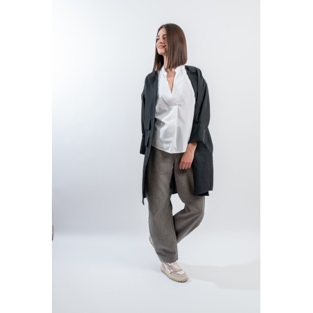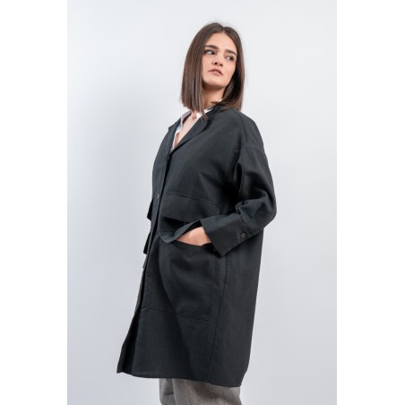 Short pea coat dress by ALESSIA SANTI, made of a fine linen and cotton blend fabric. Featuring a lapel collar, three-quarter sleeves and flap pockets on the front. Its minimal and essential silhouette combines harmoniously with the liveliness of the dress with printed micro pattern, creating a balance between elegance and practicality. Ideal for hot days, it gives freshness and style without sacrificing class. Perfect to wear even over a top and trousers.