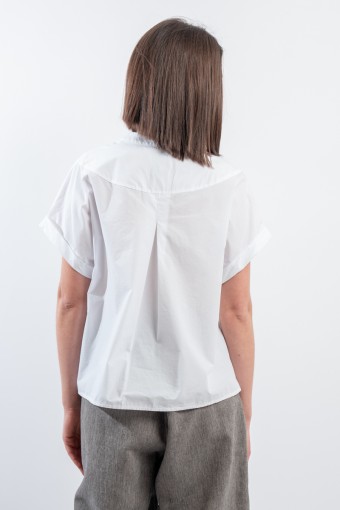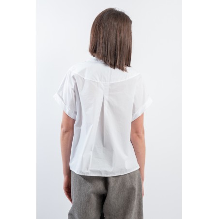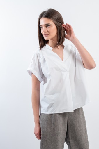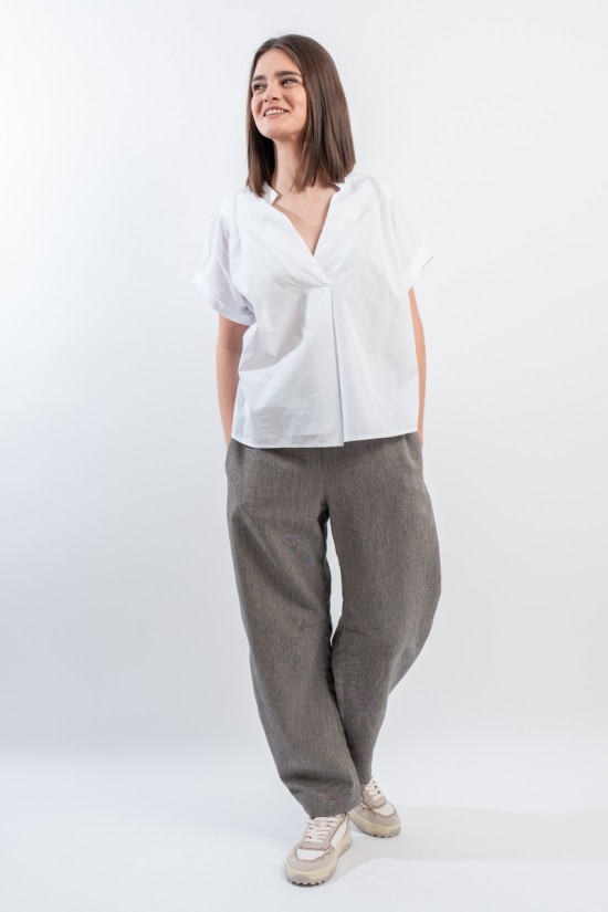Lightweight and naturally breathable is the elegant cotton blouse by ALESSIA SANTI. Characterized by the crossed V-neck and short sleeves with turn-up, where its soft cut guarantees comfort and style. It pairs easily with straight trousers and a light cardigan, creating an easy chic look ideal for any occasion. A real versatile must-have for hot summer days.
