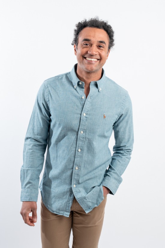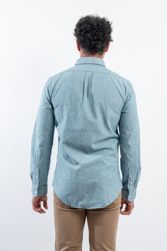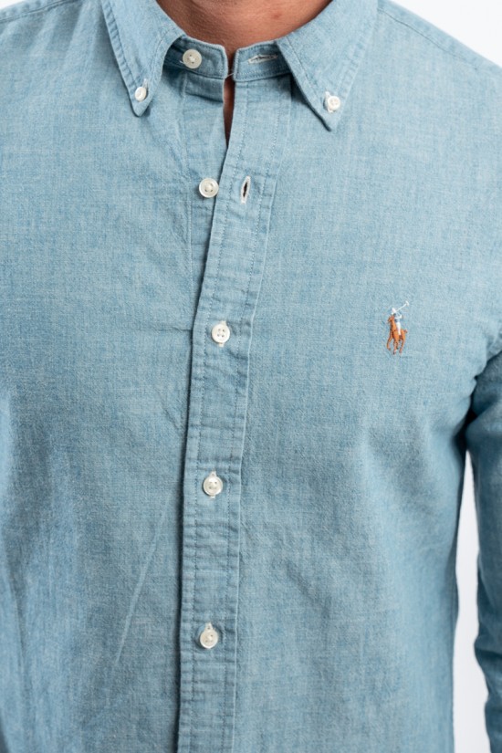 Sporty POLO RALPH LAUREN shirt in pure blue marbled cotton, with denim effect, with a slim fit cut. Featuring a yoke, two-button cuffs and button-down collar, it features the recognizable colorful embroidery of the iconic logo on the left chest. A classic garment revisited in a sporty key, ideal for simple but elegant daytime looks, ensuring maximum comfort and refined style. Perfect for those looking for a balance between casual and sophisticated, without sacrificing practicality.