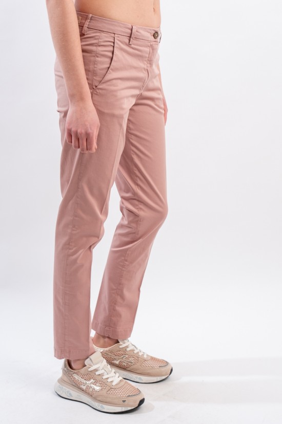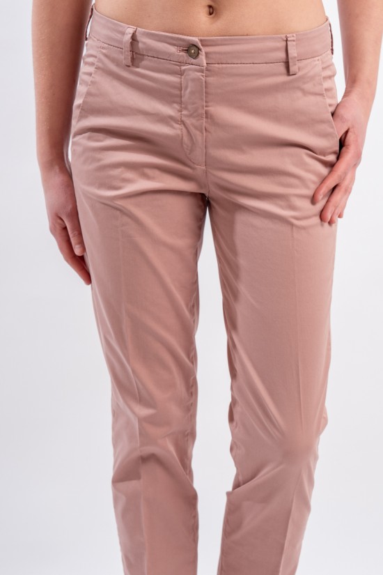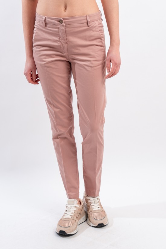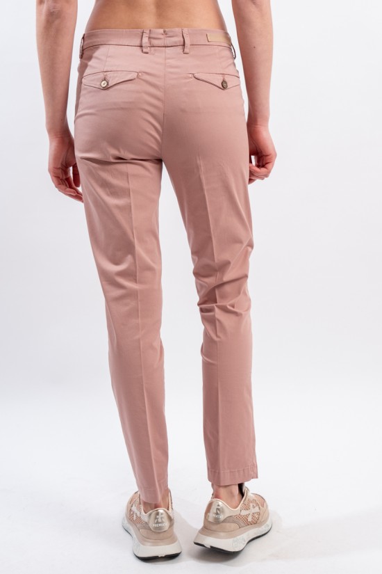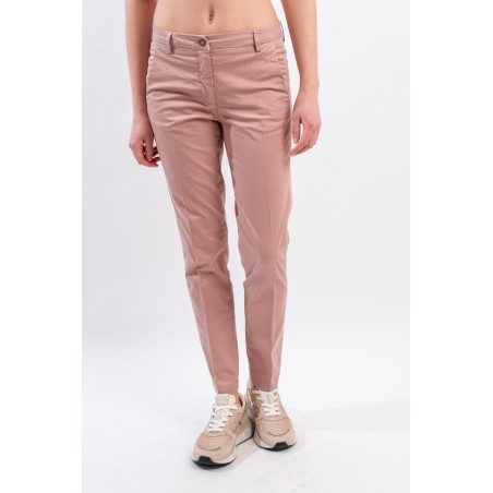 Chino trousers made of soft stretch cotton with satin effect. Slim fit with regular waist. Slanted pockets on the front and flap pockets with button on the back. Made in Italy.