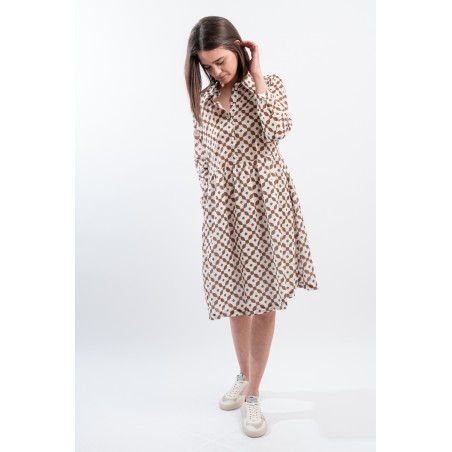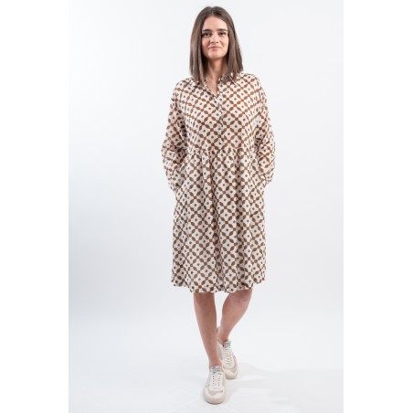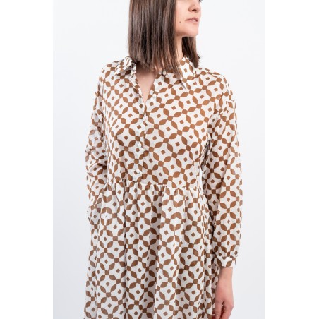 Tulip dress in micro pattern made of very light cotton voile. The dress has a fitted cut at the bust and waist, with a skirt that opens up at the hips. Shirt collar and buttons on the front, fabric belt on the back.