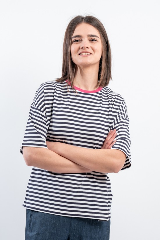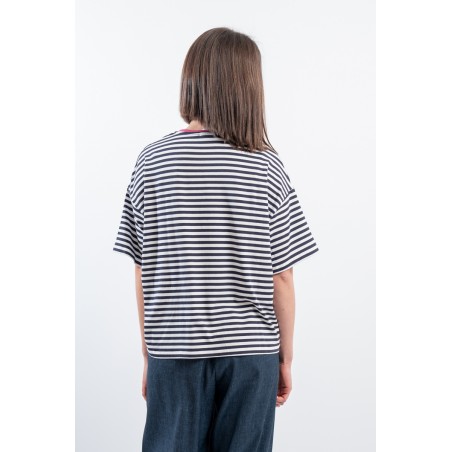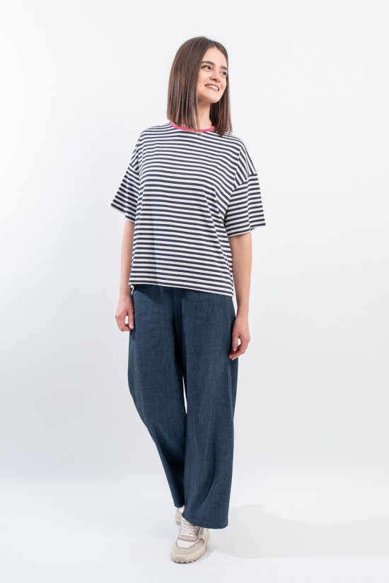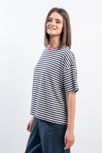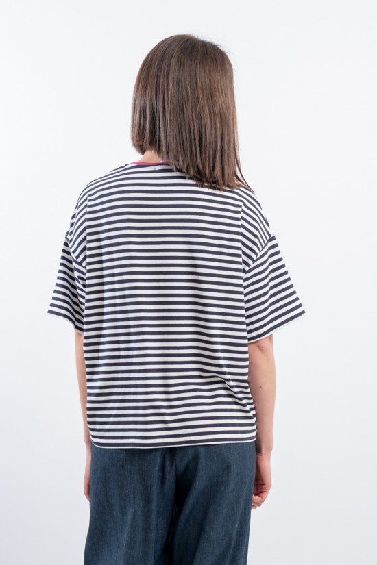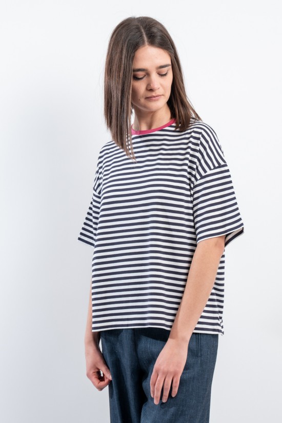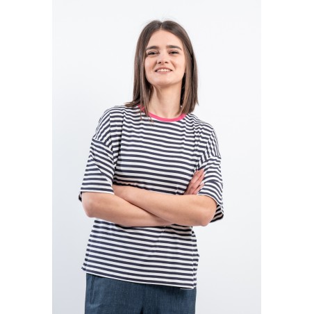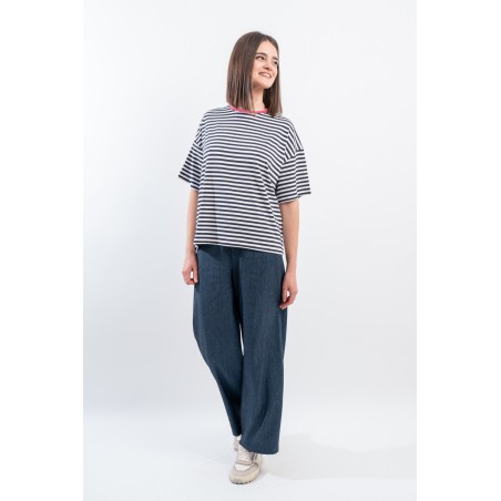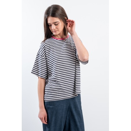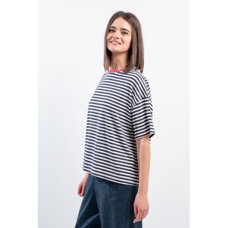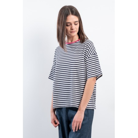 T-shirt by NIU' made of stretch viscose jersey, with a comfortable and versatile cut. It features a round neckline with contrasting piping, short sleeves and a dropped giro for a relaxed effect. The wide line guarantees freedom of movement, ideal for a casual and fashionable outfit. The striped print adds a touch of freshness and style, making it perfect for any casual occasion. A practical, comfortable and trendy garment.
