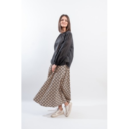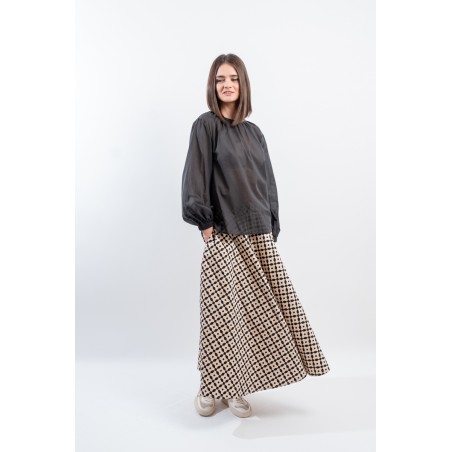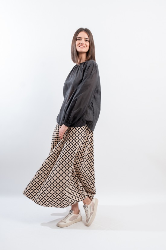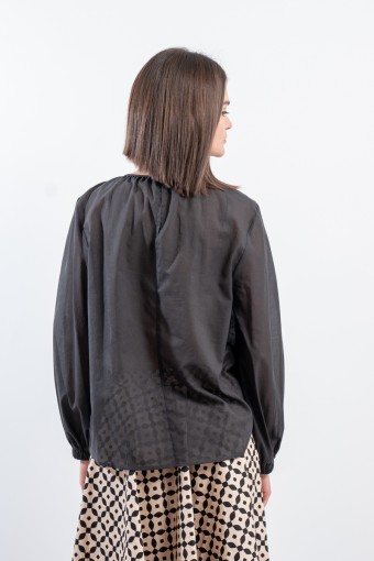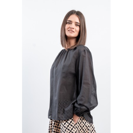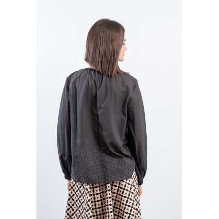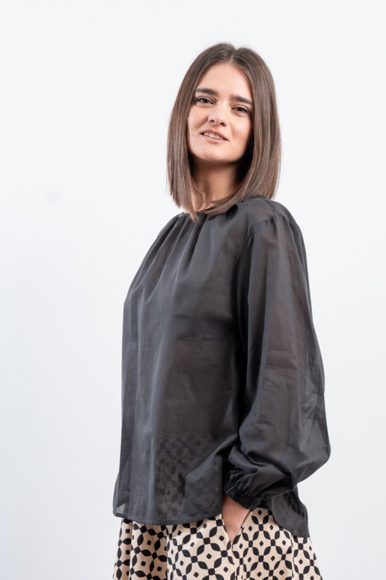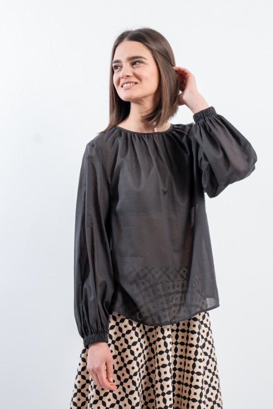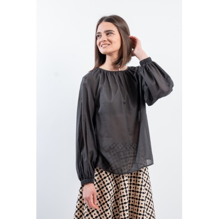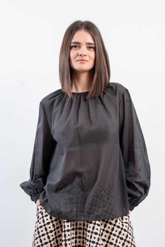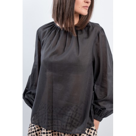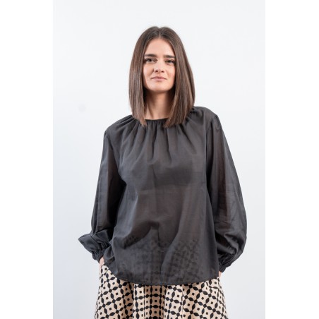 NIU blouse with puff sleeves made of very light cotton voile. Crew neck with button closure on the back. Slightly flared cut and rounded on the back.