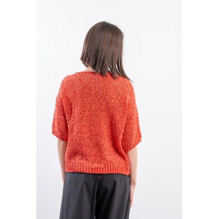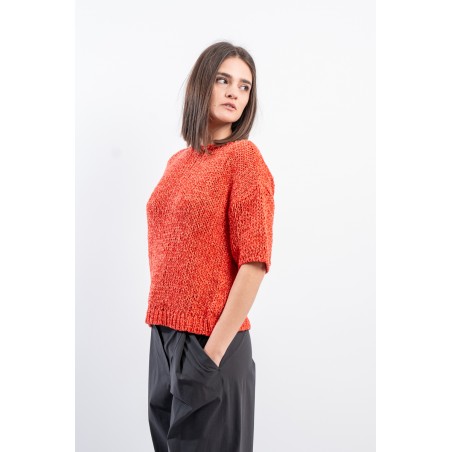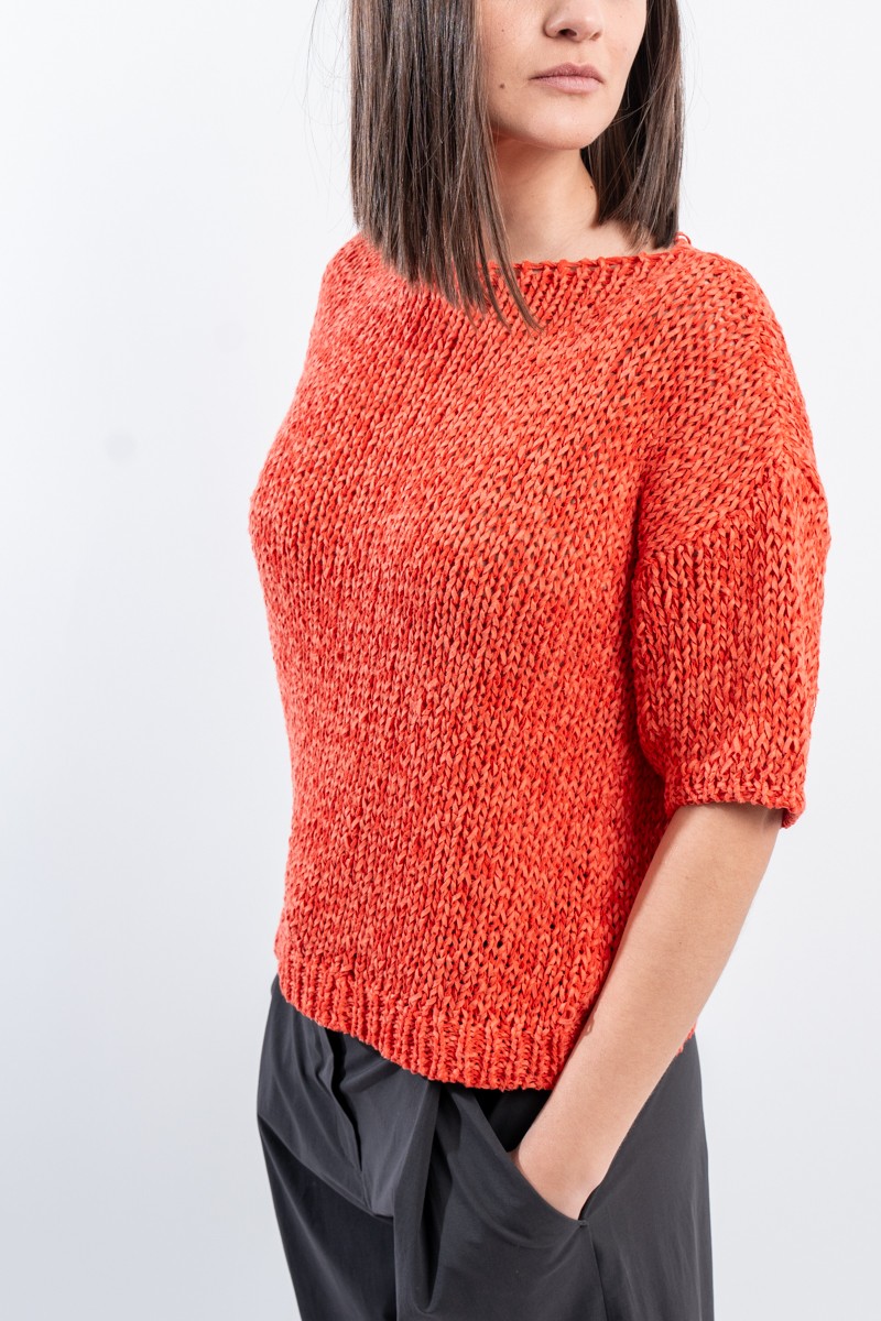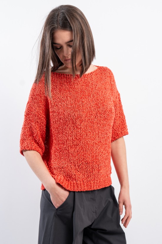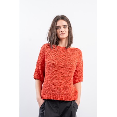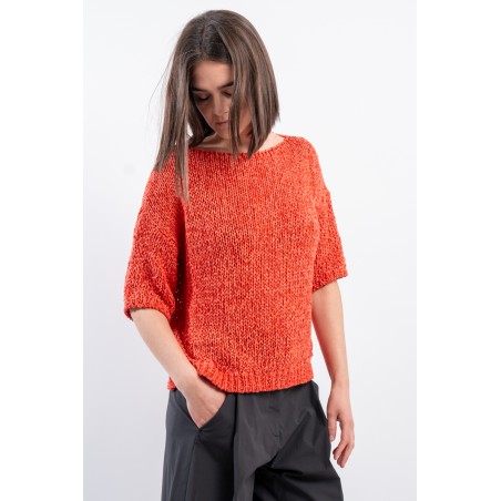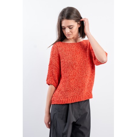 Boat neck sweater and 3/4 sleeves with loose knitting. Soft to the touch with chenille effect, it is perfect for giving a touch of color to your outfit! Made in Italy.