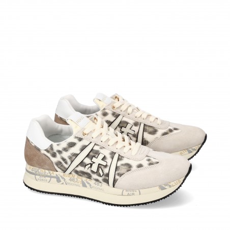 The Conny 7362 sneaker by PREMIATA is a masterpiece of style and quality. Made of speckled fabric with cream suede and taupe inserts, it offers a unique and refined look. The rubber platform sole features the iconic PREMIATA lettering and guarantees a pleasant walk, while the high quality materials ensure durability and resistance. Perfect for any occasion, this sneaker combines comfort and fashion, making it a must-have for those looking for versatility and originality in their wardrobe. A true symbol of contemporary elegance.