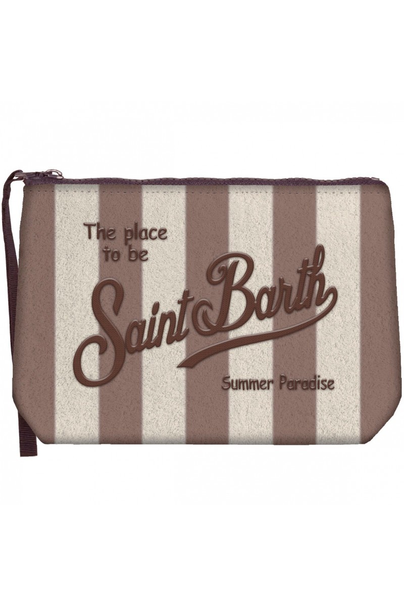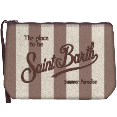 Saint Barth's Aline clutch bag made of soft "Terry Collection" terry fabric. Embellished with a striped motif and Saint Barth logo sewn in relief and contrasting color. Zip closure and grosgrain wrist loop. Great for both the beach and the city, it goes well with Saint Barth swimsuits and bags.