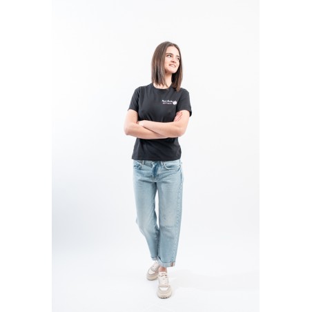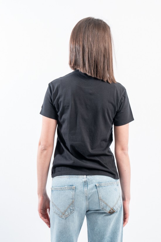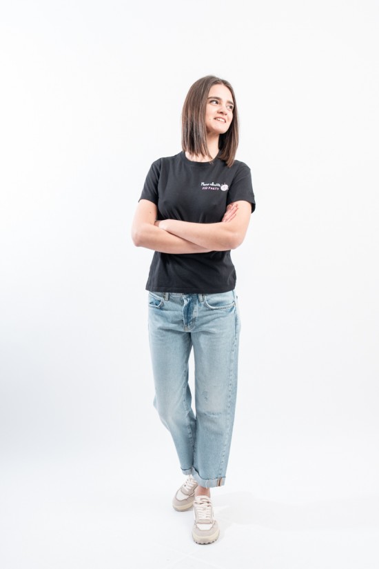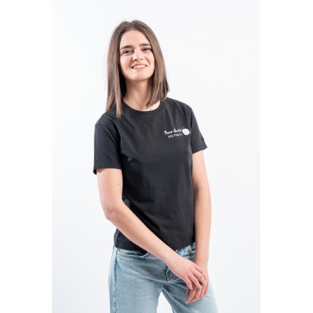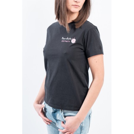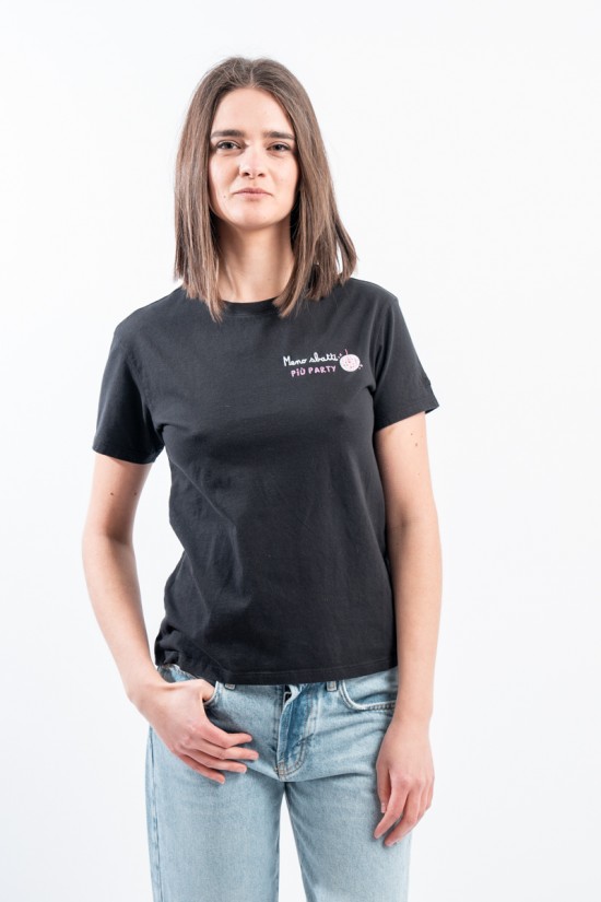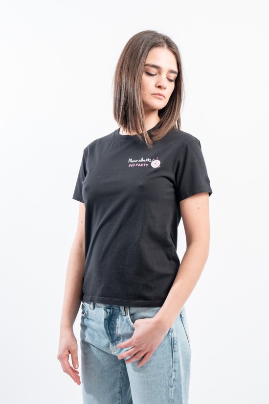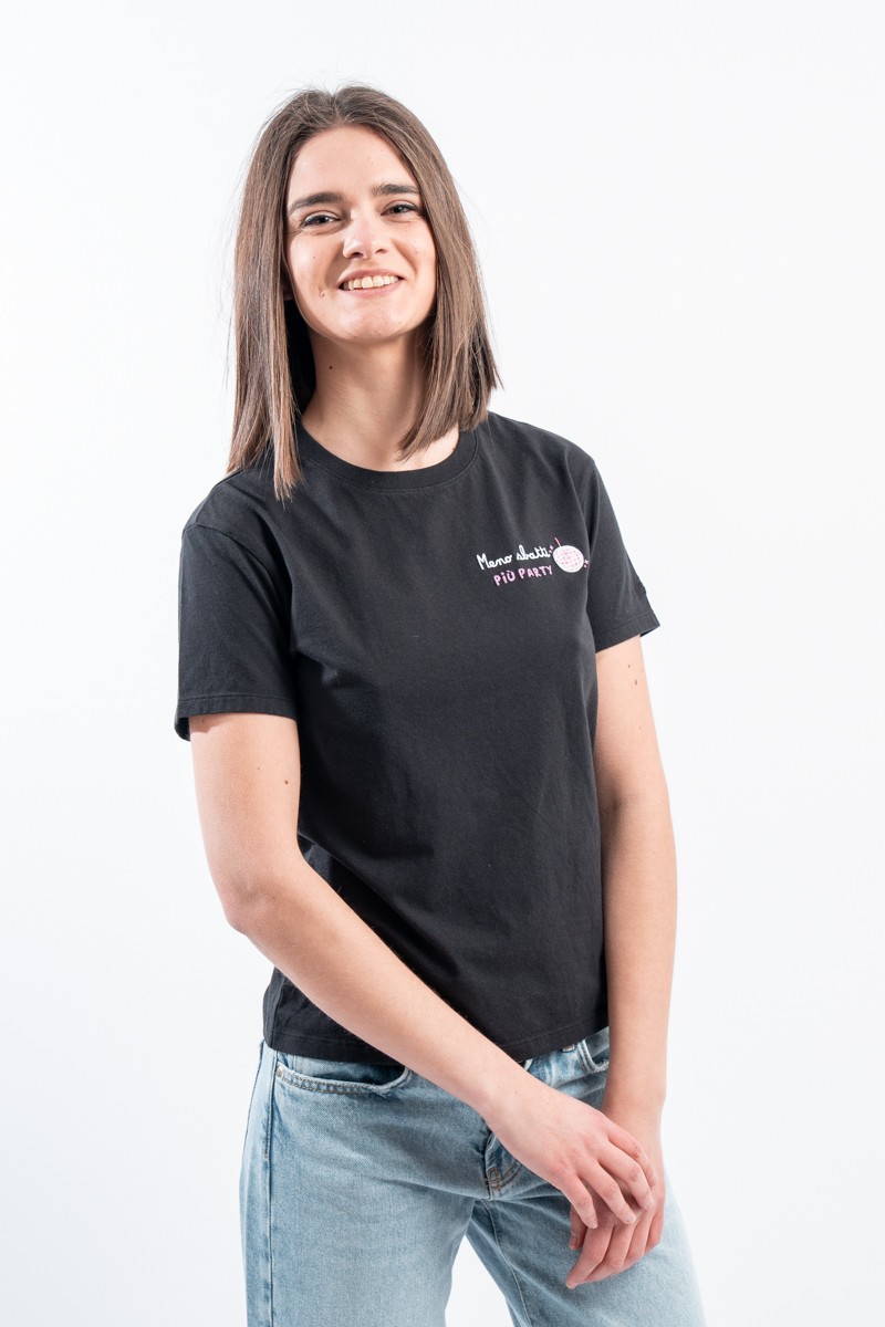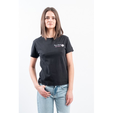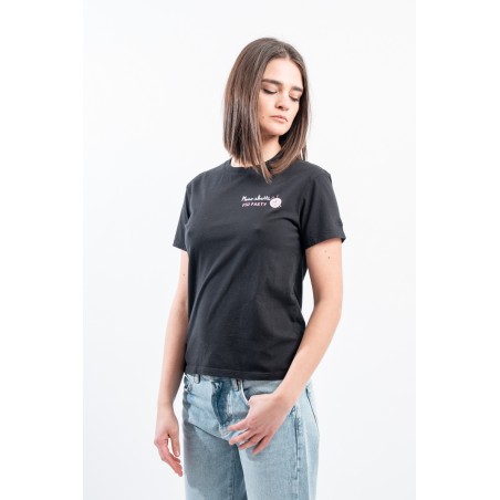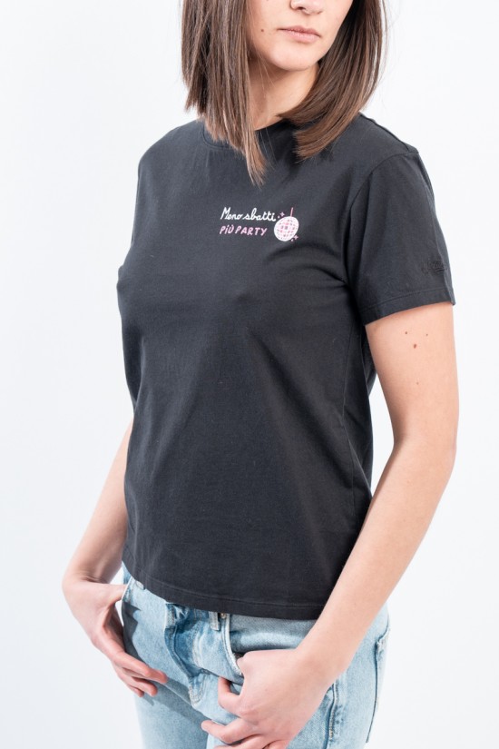 Crewneck T-shirt made of 100% cotton yarn, short sleeves. Embellished with "Less bang more party" embroidery on the chest. With a versatile and glamorous style, perfect for any occasion of use, it is an original garment, like the wearer!